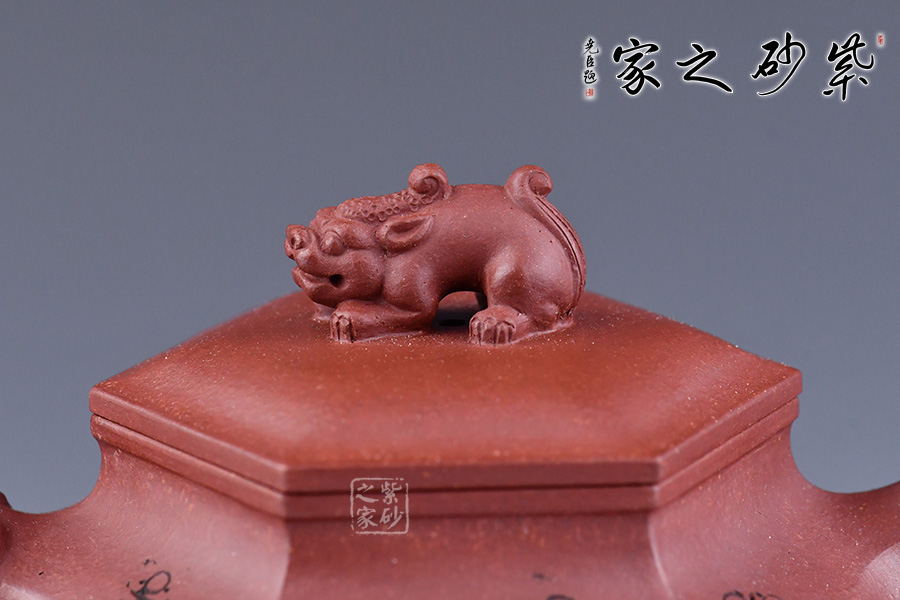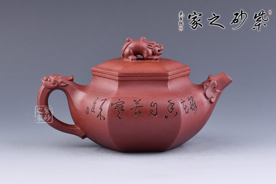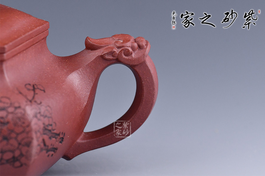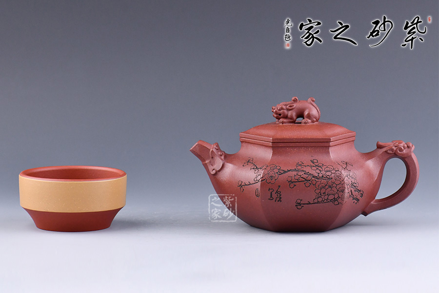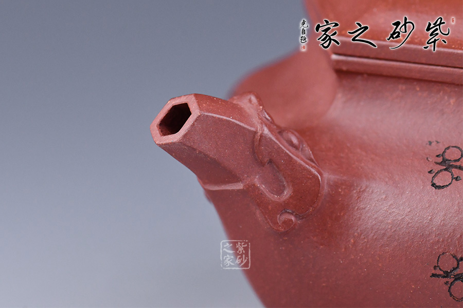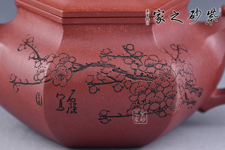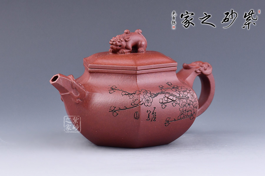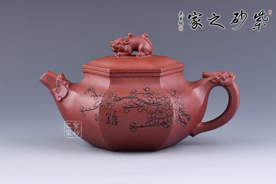 此壺六方造型方中帶圓,壺把、鈕、嘴分別為三只瑞獸,給壺增添滿滿的福氣,加上陶刻名家朱炳浩先生刻繪的梅花圖案,梅花的花瓣都是5瓣,象征著五福,所有還寓意著吉祥幸福。整壺皆是祥瑞福氣,送人佳品!