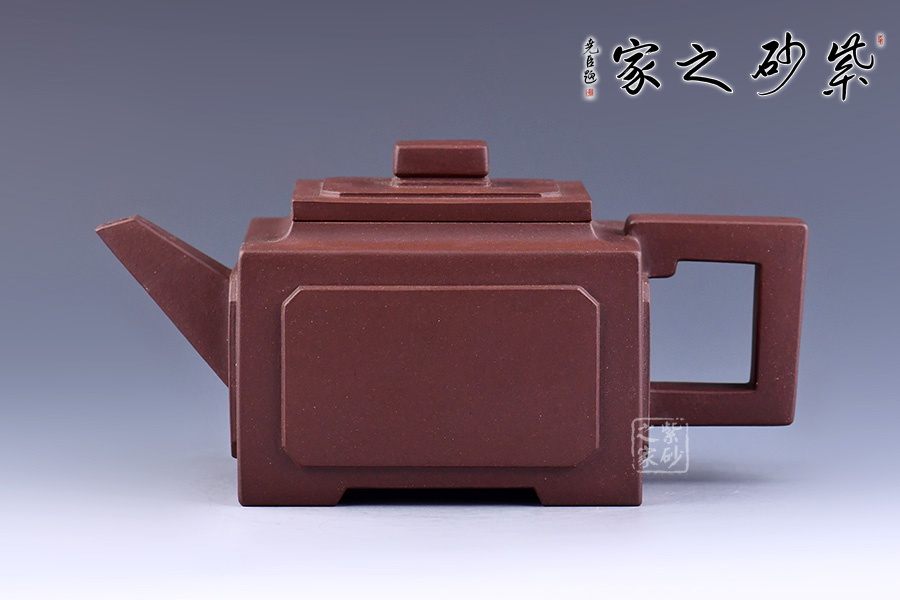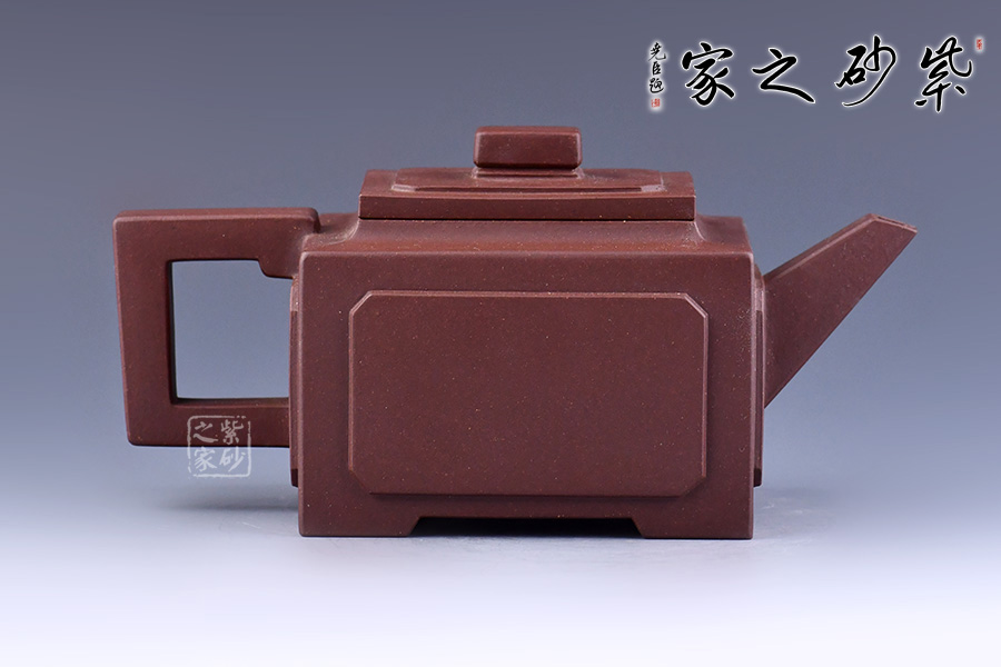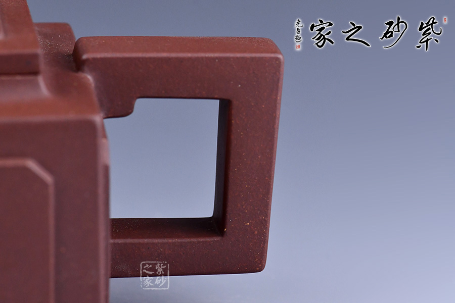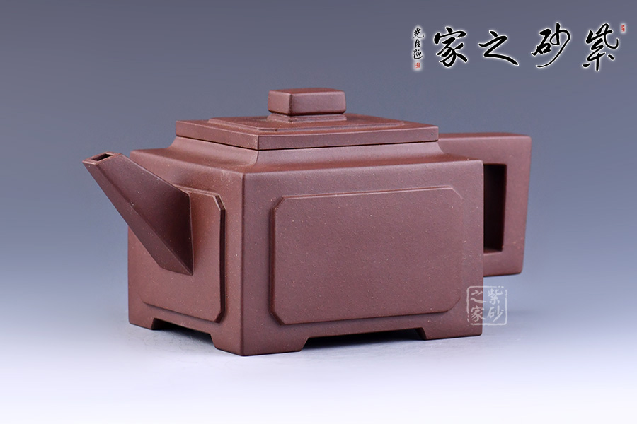 壺身、壺口、壺蓋、壺鈕均為正方形。側(cè)視,整個壺呈—“亞”字形。形制方正嚴(yán)謹(jǐn),渾樸厚實,面大且寬,角鈍而韻,線挺而直,口蓋方而寓圓,底圈大而趁勢,流有直曲變化,把方而切體,鈕洞扁而大。