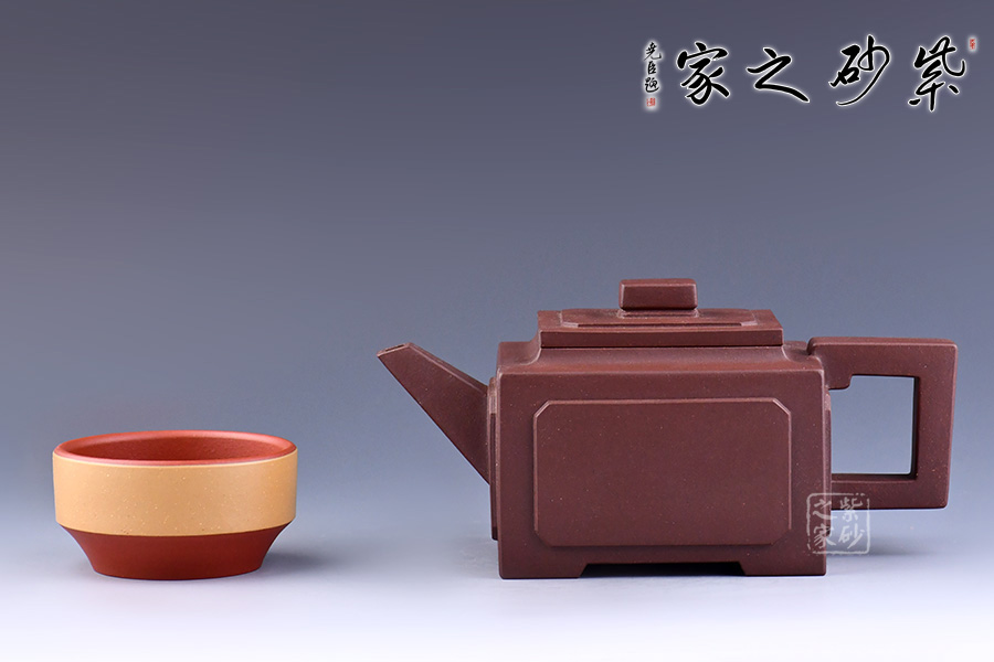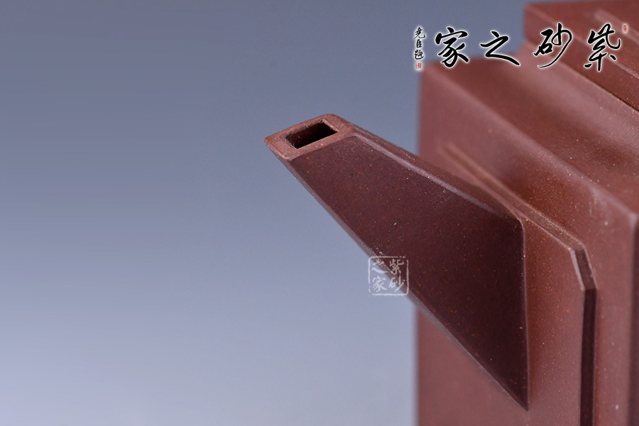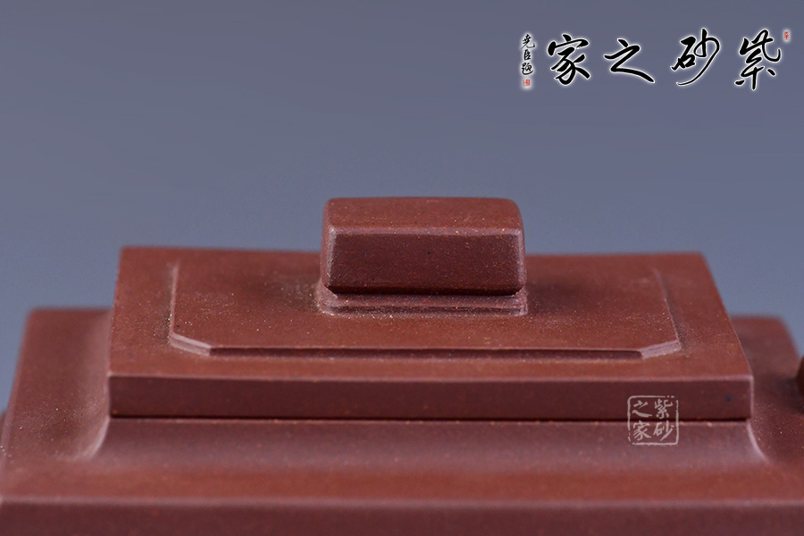 此壺是在經(jīng)典器型亞明四方上創(chuàng)新而來,亞明四方是方器中經(jīng)典的器型之一,有著古樸典雅的造型,又有渾厚大氣的特點。整體造型比例協(xié)調(diào),線面挺括有力;輪廓分明,全器氣勢挺拔,英姿颯爽,成就紫砂方器之美。