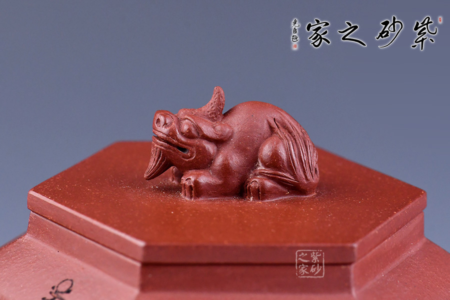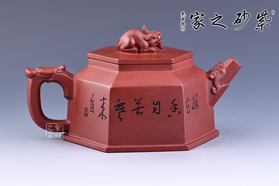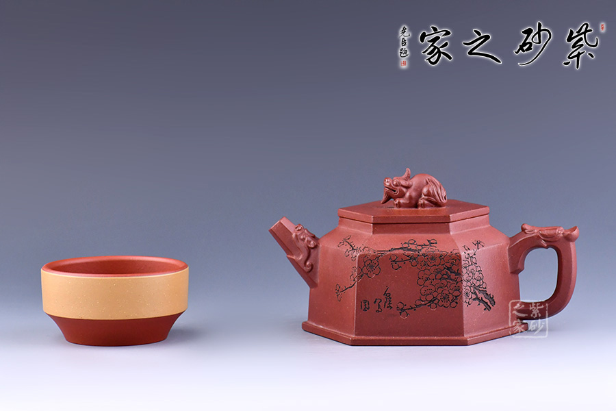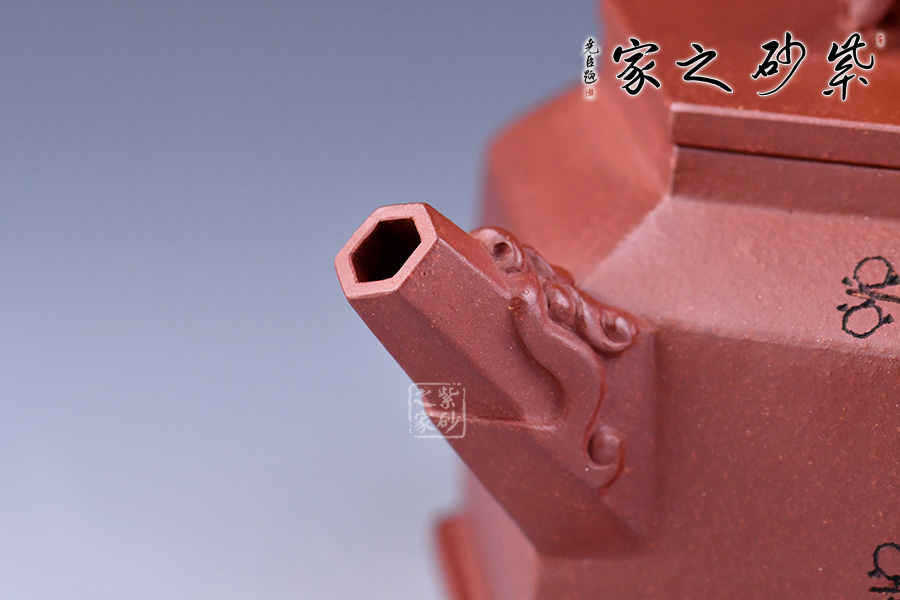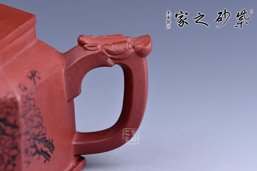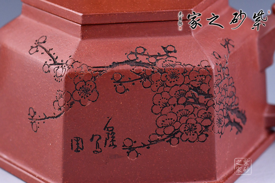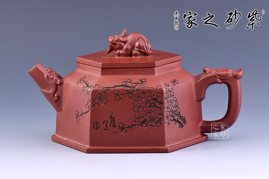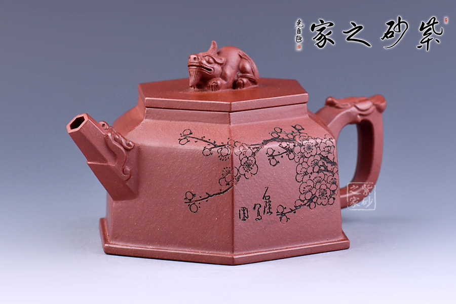 壺形簡約美觀、棱角清晰、流暢大氣。用六方幾何造型,更令其形體明快挺秀,具有陽剛之氣,輪廓分明,平穩(wěn)莊重。壺嘴、鈕、把皆為龍?jiān)煨脱b飾,確是至尊之至。壺身刻繪梅花增添雅韻。
