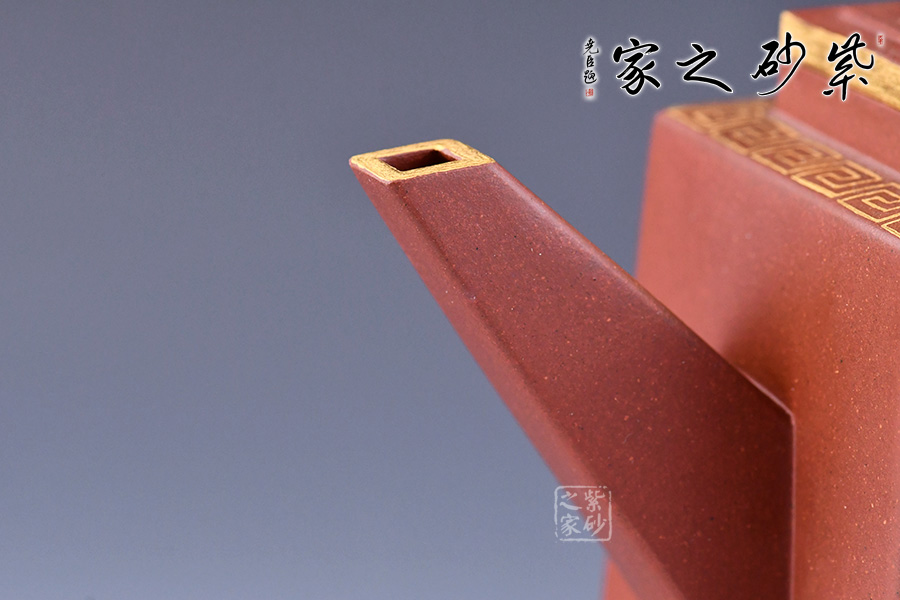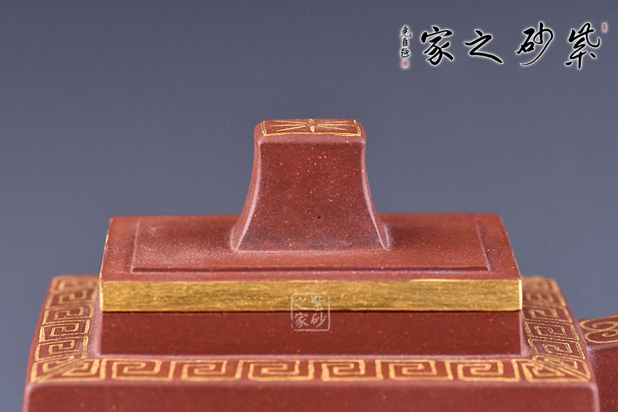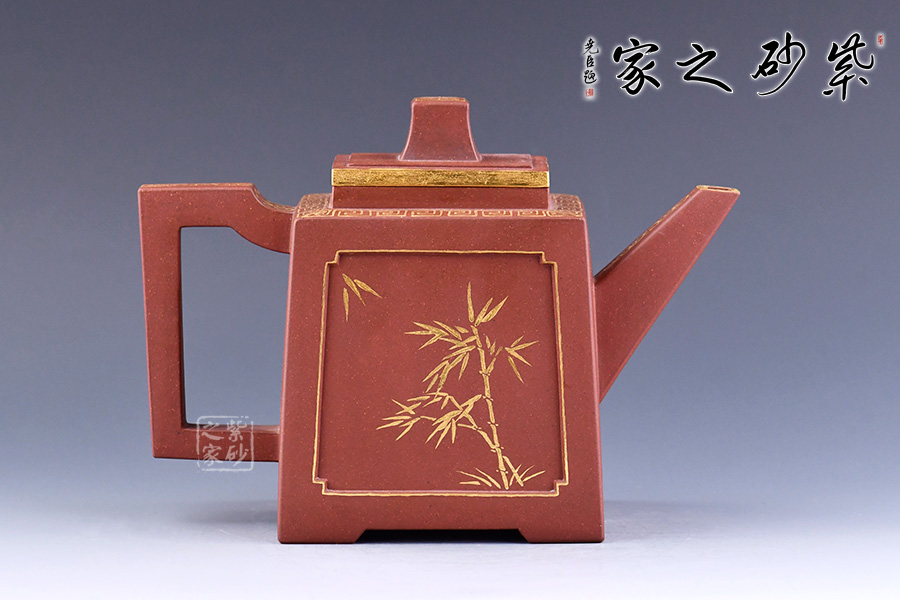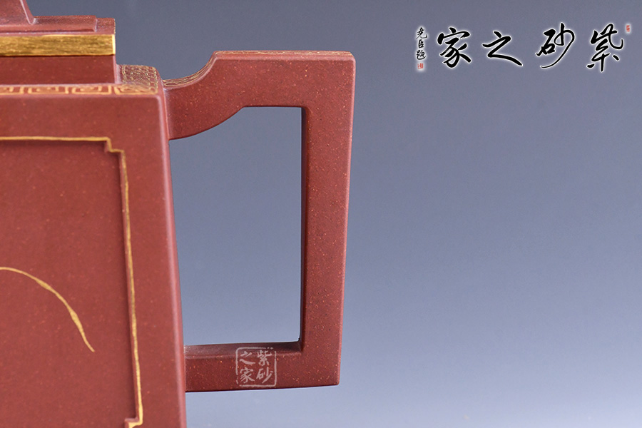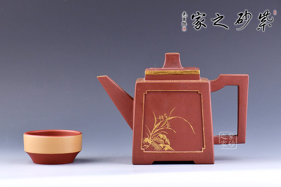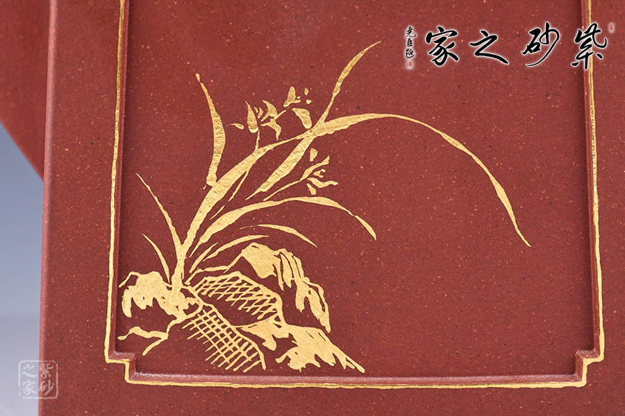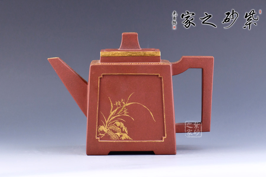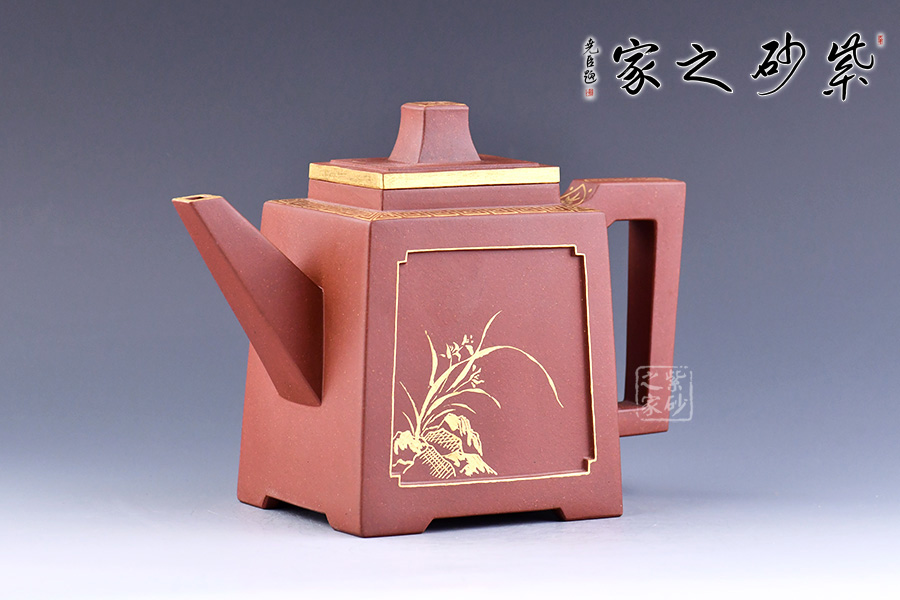 壺身的棱角自上而下,棱角分明,壺身呈金字塔狀,凝重大方,協(xié)調(diào)中顯現(xiàn)質(zhì)樸,寬厚的壺身預(yù)示人的胸懷;壺身開窗樣式描金繪制蘭花紋樣,蘭花被稱為花中君子,寓意是典雅、高潔、愛國、堅(jiān)貞不渝。四方壺蓋邊緣平整,壺肩裝飾吉祥紋,四方鈕亦有設(shè)計(jì),直流嘴四方形迅猛有力,端把剛中帶柔,端握舒適,底部犴門成四足式,折角內(nèi)隱的壺足托起整壺,使壺凌空,打破方器的沉重感。壺?zé)o論在做工、口蓋處理以及泥料選擇都頗為用心,是品茗收藏的上等壺品。