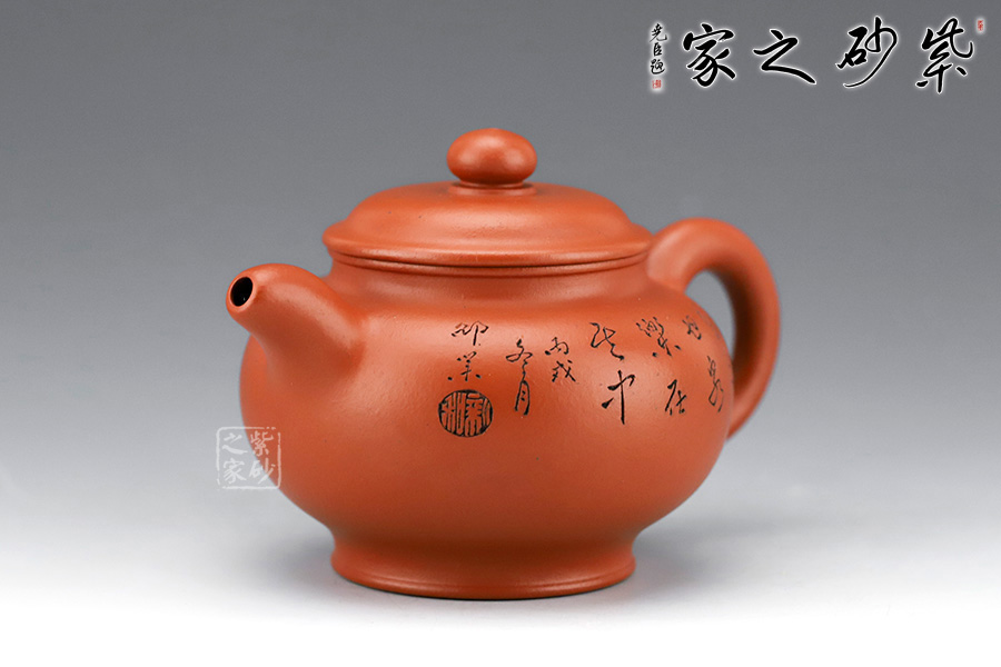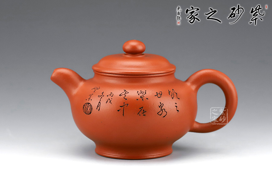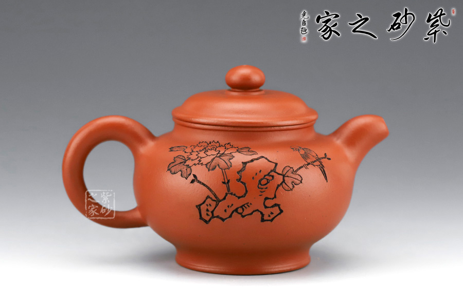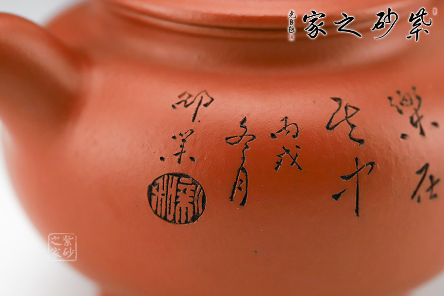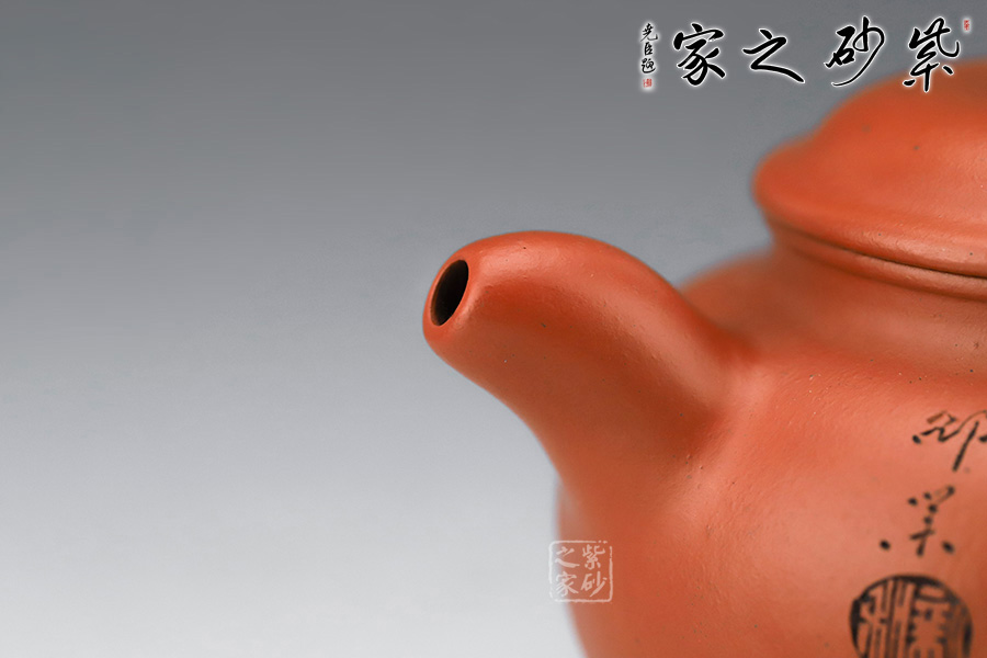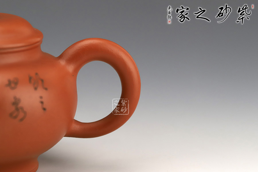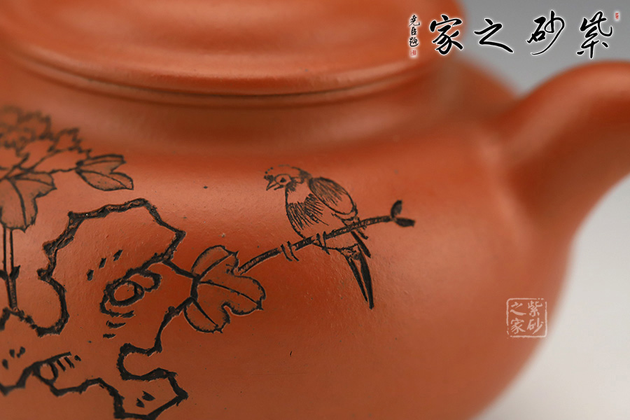 此壺有著渾圓的壺身,半圓的壺蓋,圓鈕,線條流暢,比例得當,壓蓋略微渾厚,點線之間見出魅力,子母線口蓋溫和嚴密,骨肉亭勻,簡練大方,制作頗見功力。彎流嘴胥出,在端頭下壓,柔美之姿明顯,壺柄略微上抬之后優(yōu)雅滑落而下,形成一條圓潤飽滿的弧線,樸雅大方。壺身雙面刻繪,刀法利落,細節(jié)精細,工藝十分精湛。