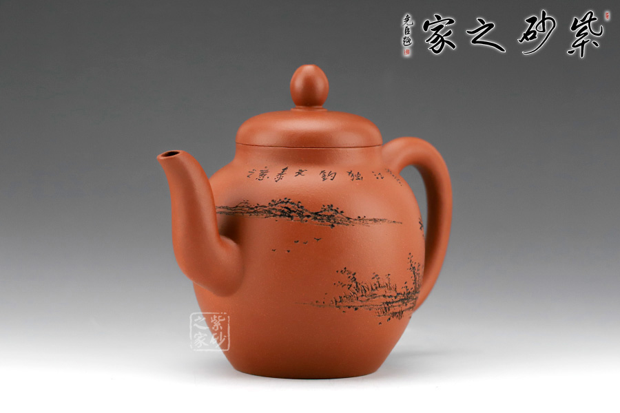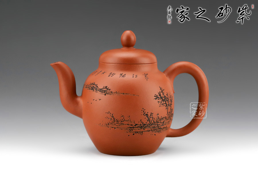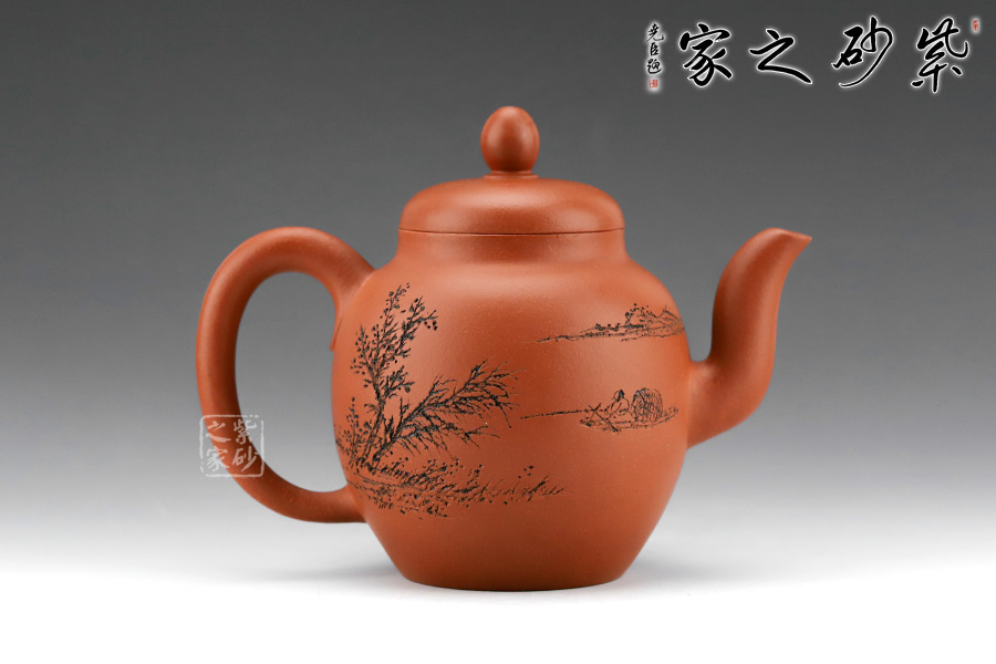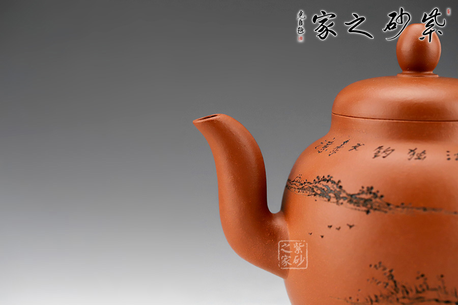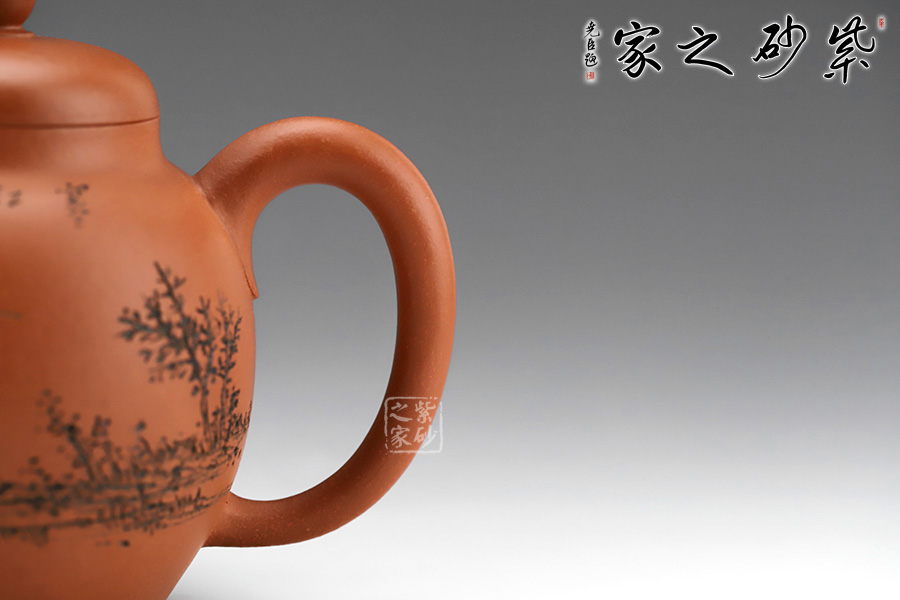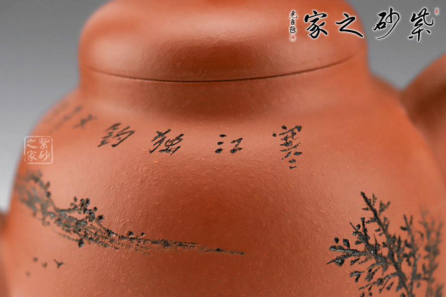 渾圓的壺身顯華貴,線條流暢,比例恰當(dāng)。嘴和壺把呈相對(duì)之態(tài),一收一放,妙趣天成。壺鈕以一粒圓珠飾之,但又如同菩提蓮子,精細(xì)巧制。壓蓋略微渾厚,點(diǎn)線之間見出魅力,子母線口蓋溫和嚴(yán)密,骨肉亭勻,簡練大方,制作頗見功力。壺身刻繪寒江獨(dú)釣圖,寥寥數(shù)筆勾出精美山水畫,讓人愛不釋手。