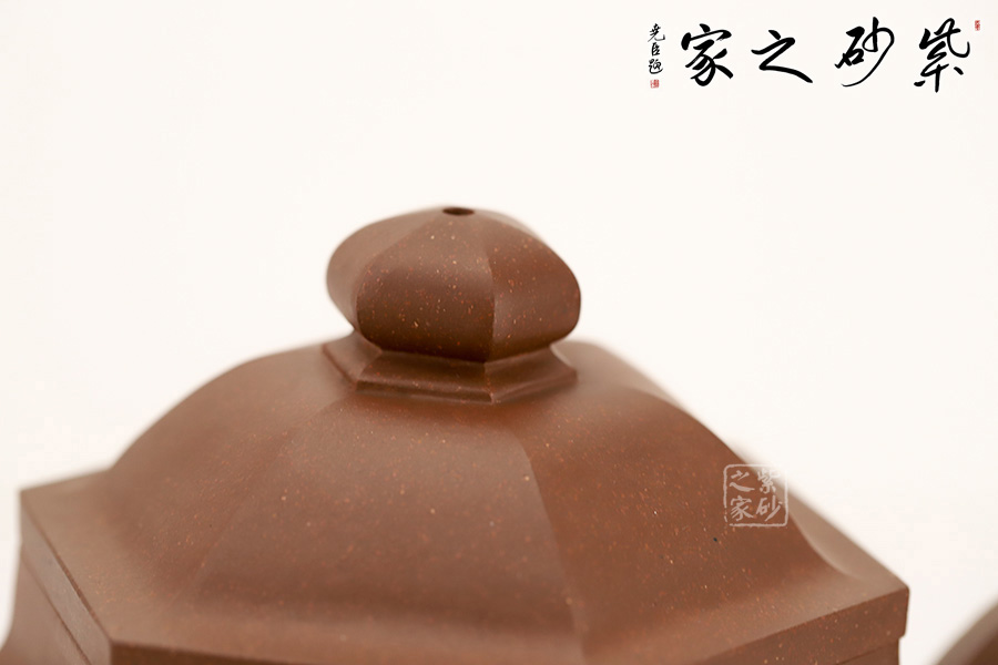 此壺以古代宮燈為原型,造型新穎別致,壺面呈六方,六方形態(tài)貫穿壺型始終,不僅方中藏圓、線(xiàn)面挺括平正、輪廓線(xiàn)條分明,更給予人們干凈利落、明快挺秀之感。壺口與壺蓋均呈六方形,對(duì)稱(chēng)一致,任意轉(zhuǎn)動(dòng)方向均可對(duì)齊。三彎流、大耳把、珠形鈕均設(shè)計(jì)成六方形,相應(yīng)相稱(chēng),細(xì)膩精巧,充分演繹出六方器型的高遠(yuǎn)風(fēng)范。