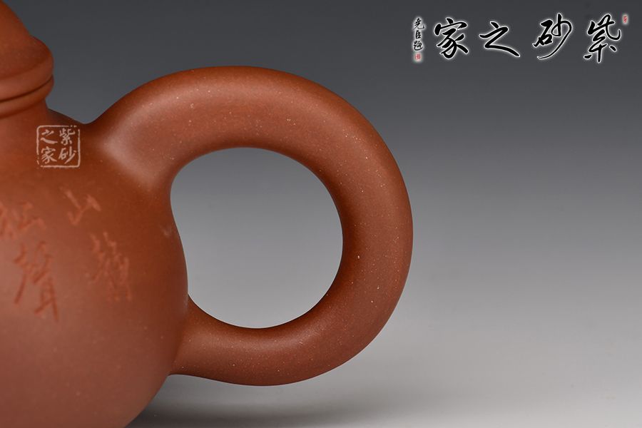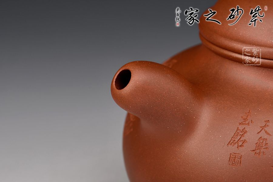 壺身扁圓可愛,輪廓明朗,圈足和壺頸上下對(duì)應(yīng),美感頓生。壓蓋的子母線對(duì)仗工整,嚴(yán)絲合縫。珠型壺鈕由鼓蓋拱衛(wèi),精巧圓滑,似稀世珍寶。壺嘴和壺把渾圓短粗,氣質(zhì)沉穩(wěn),非常有古典的韻味。通身來看,此壺之精妙寓巧于拙,越是把玩越覺韻味無窮。