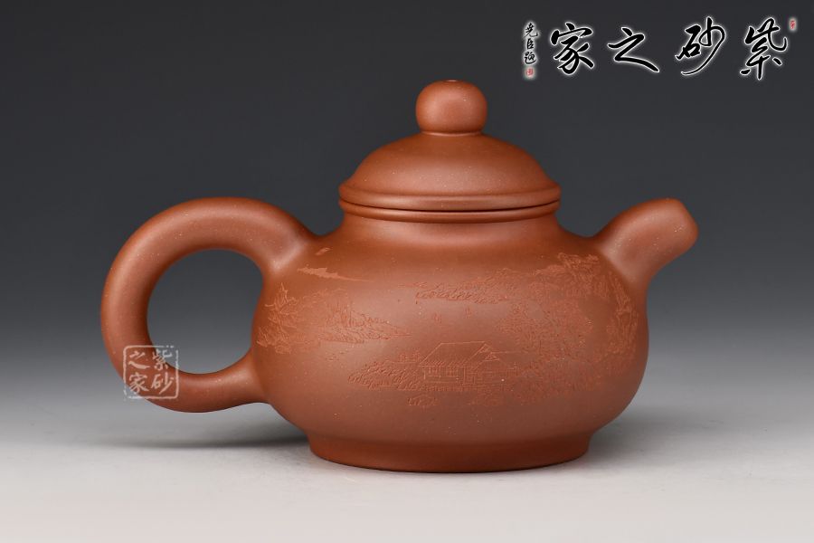 天樂(王智明)刻繪,王福君之子。中國工藝美術(shù)大師譚泉海的入室弟子,得師傅真?zhèn)?。在紫砂業(yè)內(nèi)大型比賽中獲獎(jiǎng),陶刻界新生力量,刻繪的詩句“山靜松聲遠(yuǎn),秋清泉?dú)庀恪闭宫F(xiàn)出的生活情調(diào)甚是迷人,而背面的山水畫更添情懷。