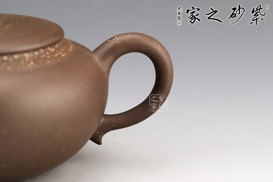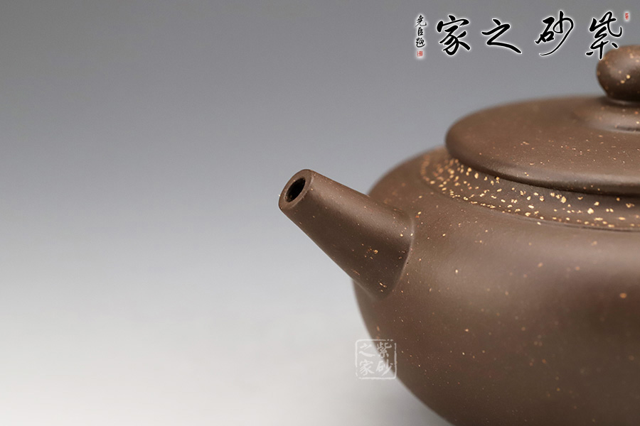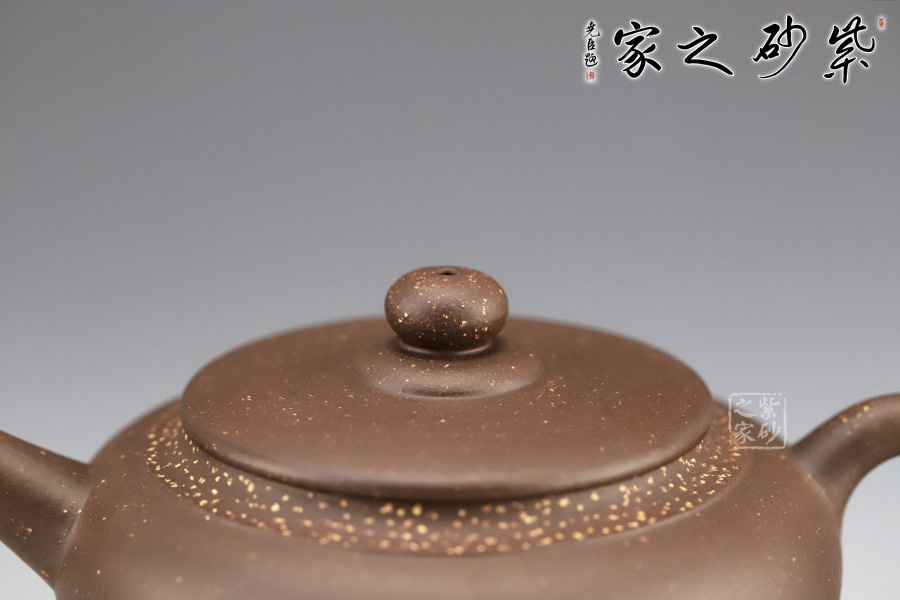 壺身圓潤(rùn)似仿古器型,壺頸玉帶鋪砂工藝,星星點(diǎn)點(diǎn),壺嘴直挺,出水爽利。壺蓋平,壓蓋設(shè)計(jì),蓋中突起承托壺鈕,壺鈕像一粒算盤珠小巧可愛。起名隨想,也是老師在日常生活中獲取的巧思,簡(jiǎn)約而不簡(jiǎn)單。