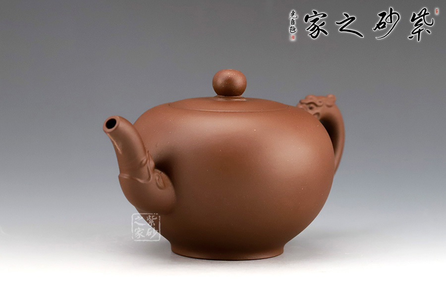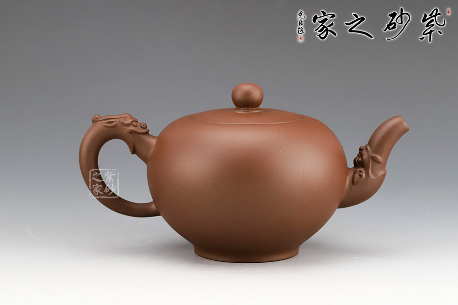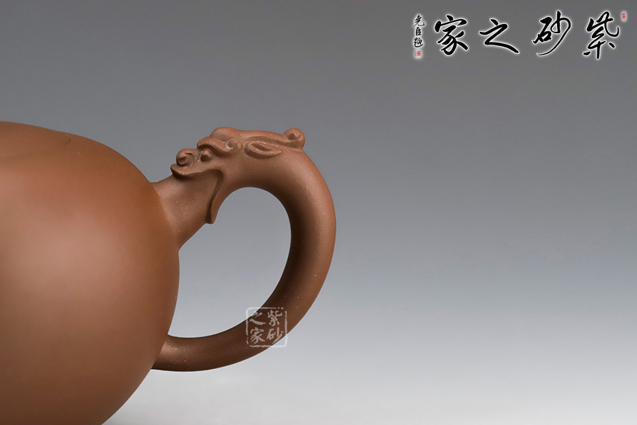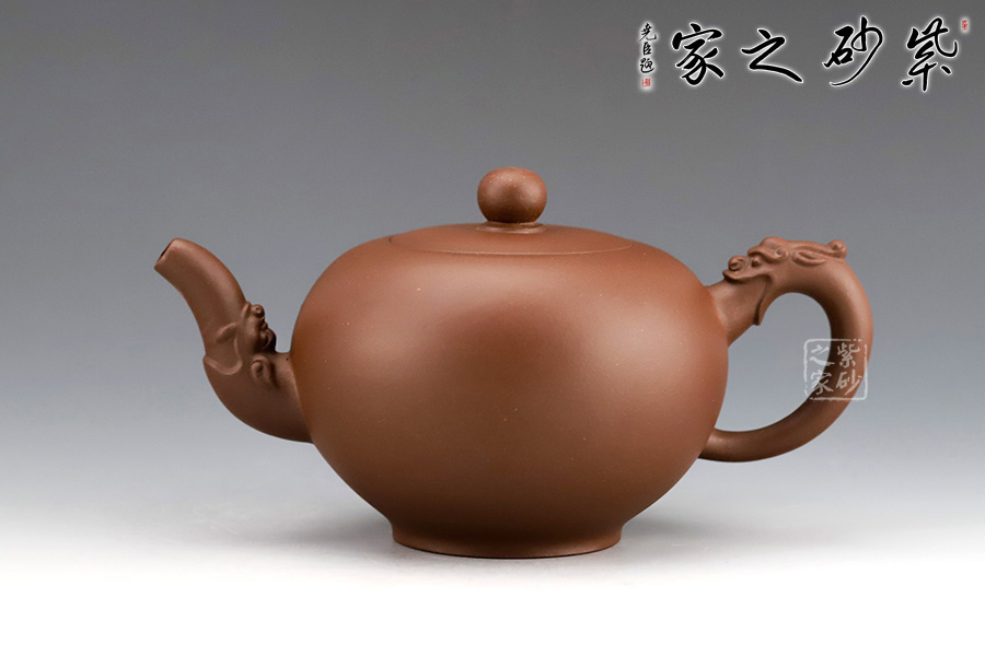 造型簡練精致,工藝無可挑剔。壺鈕與壺身均為圓潤飽滿的球形,如旭日東升,如一粒明珠,嵌蓋設(shè)計,壺蓋與壺身融為一體,更顯示出壺身的圓潤。彎流胥出,與壺柄皆有龍元素,雙龍戲珠之意,整器比例均衡,穩(wěn)重端莊,不可多得的上佳之器。