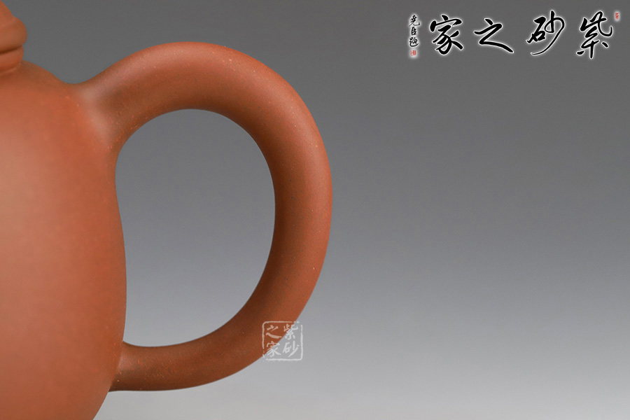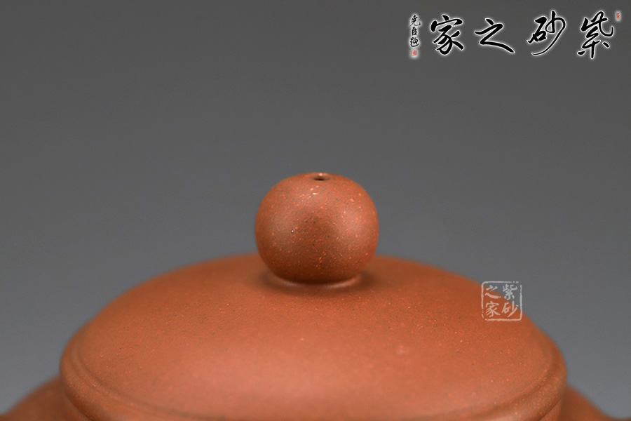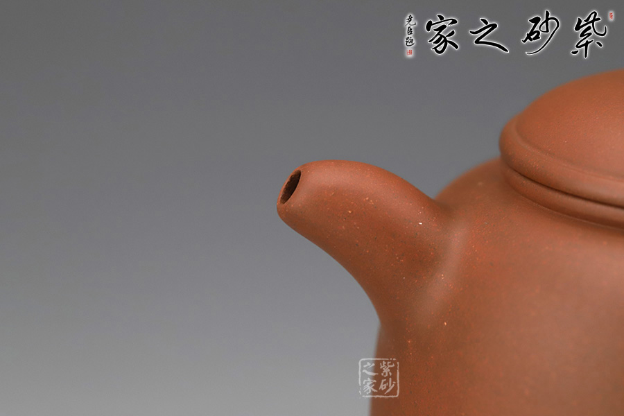 匏尊是蘇軾的《前赤壁賦》中的酒具,以此命名,就是表達(dá)了曠達(dá)的人生情懷。此壺壺身圓而略長之形,扁圓頂壓蓋,壺鈕為一圓珠點(diǎn)綴于壺蓋之上,靈動而有生氣;耳形壺柄上大下小,在整壺比例中大小適中,易于持握,有一種舒心的隨意之感;器型周正,飽滿的曲線上延便是嘴微曲的短流,短流與壺體的結(jié)合十分協(xié)調(diào);器形之簡單、線條之收斂何處不體現(xiàn)出一種淡然之態(tài),即便是需要承擔(dān)整個壺體之重的壺鈕、流香茶之源的壺嘴,處處都是自然而出,毫不張揚(yáng)。