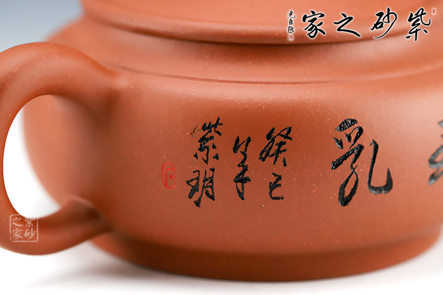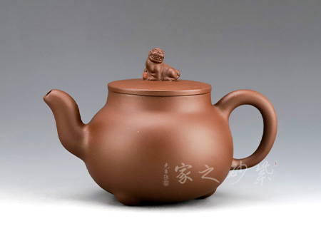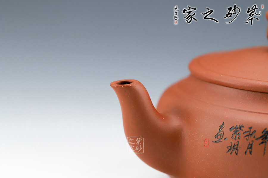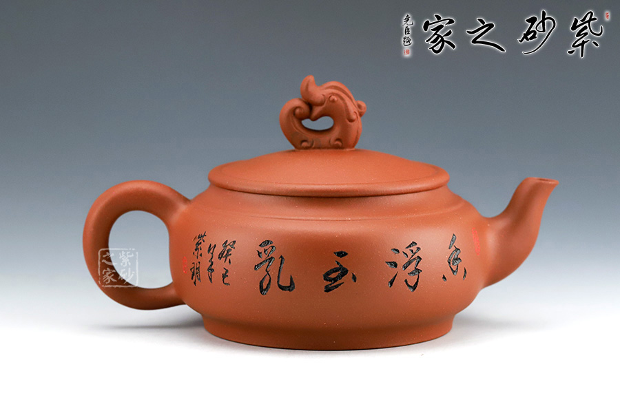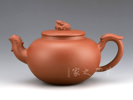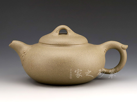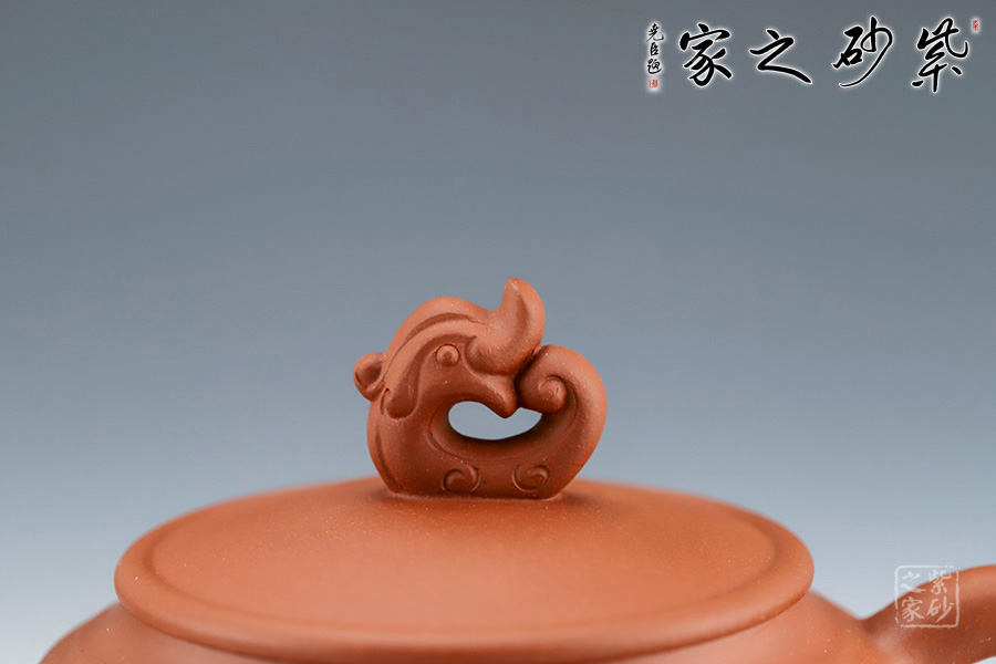 壺嘴自然伸出,微微上翹。壺體為扁圓,敦厚樸實,沉穩(wěn)感較強。把柄彎曲有度,握持舒適。蓋為壓蓋,將壺口收斂于內(nèi)。壺蓋上一抽象龍形為壺鈕。