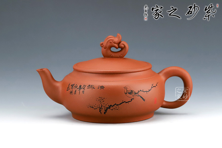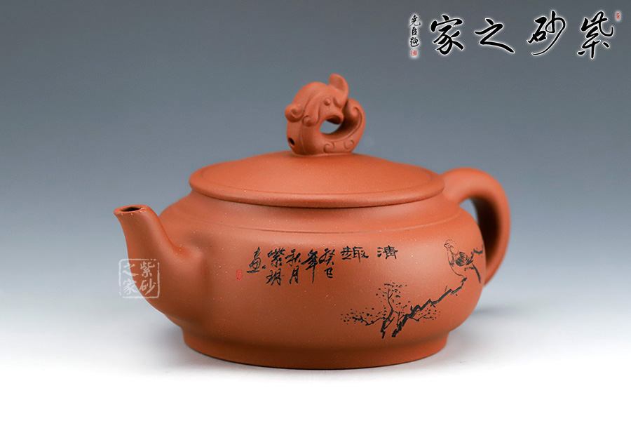 此壺在傳統(tǒng)的壺型上增添了新意,壺身圓潤,線條流暢,嘴把挺拔有力,壺鈕以龍作裝飾,無不體現(xiàn)表達吉祥如意的意圖。
