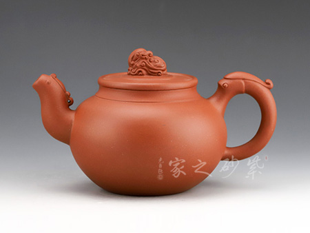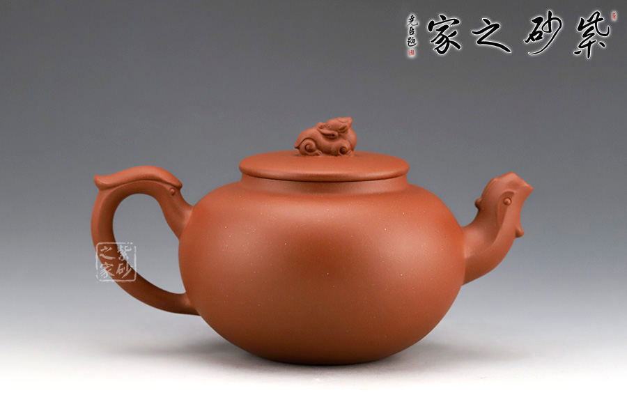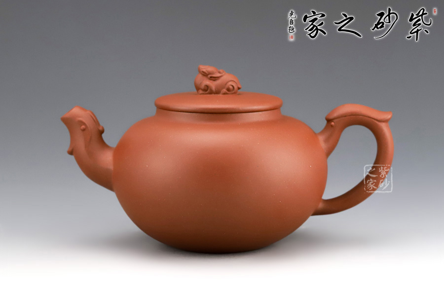 圓壺形,以龍為裝飾,以鳳為形制,兩相結(jié)合,呈現(xiàn)祥瑞的色彩。壺流作“龍吐水”形,挺拔有力,壺把作鳳尾,別具神韻。壺鈕龍蹲坐平蓋。整體造型簡(jiǎn)單簡(jiǎn)潔,各方搭配相得益彰,把玩易上手。