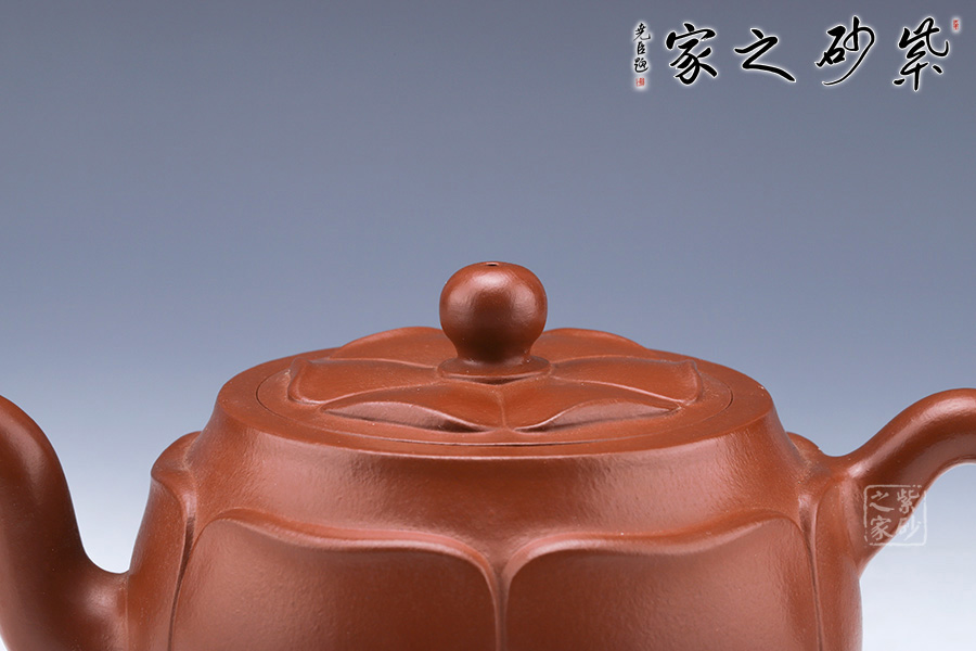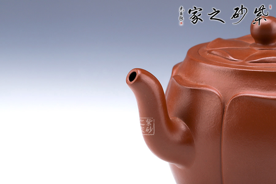 壺體上豐下斂,亭亭玉立。一粒碩大的壺鈕與壺身相映成趣,三彎流與耳形壺把細(xì)而柔長(zhǎng),暢通無(wú)礙,工藝之高超令人嘆為觀止。整款壺流露出自然之美,壺蓋一圈菱花,壺身一圈菱花,上下齊放,雖不嬌媚的色調(diào),卻別具一番韻律。
