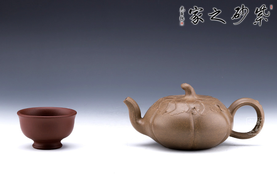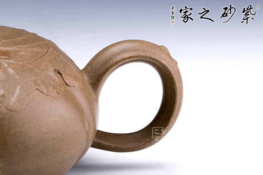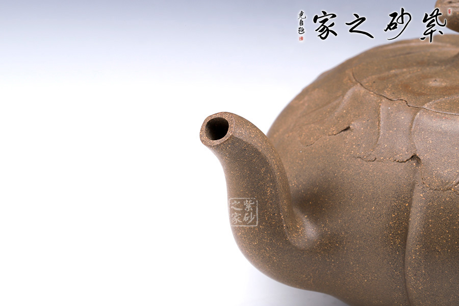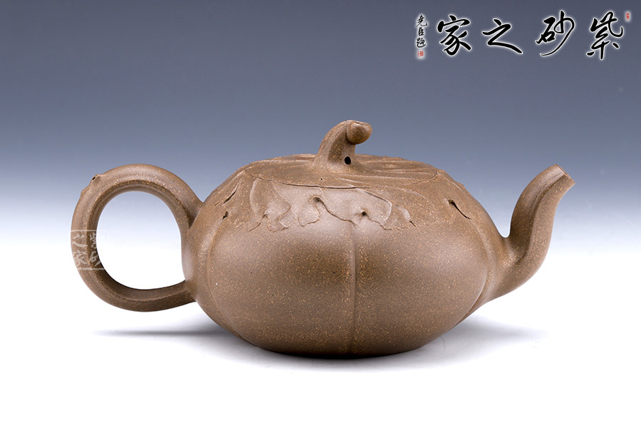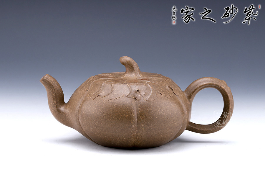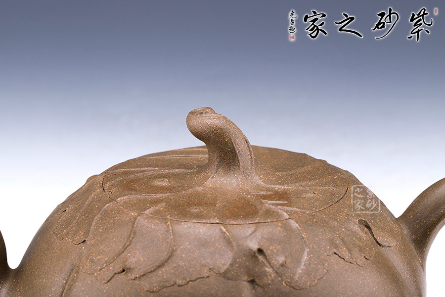 此瓜壺做工精細,泥料優(yōu)秀,造型似南瓜一般,顯得逸趣橫生,形象生動。是花塑器與筋紋器的結(jié)合,南瓜形壺體、反蒂狀壺鈕、瓜藤形的壺嘴壺把相呼應(yīng),壺身的制作自然生動,所有的筋紋刻劃逼真,造型自然可愛,老師以其嫻熟的技藝以及巧妙的工藝成功塑造出如此精致規(guī)整而富有生命的南瓜壺!