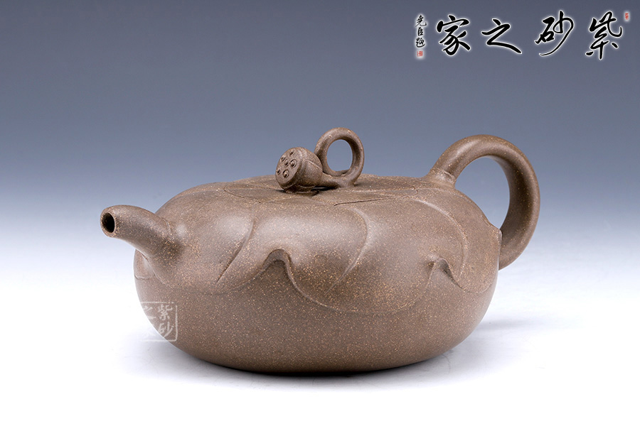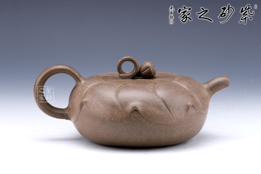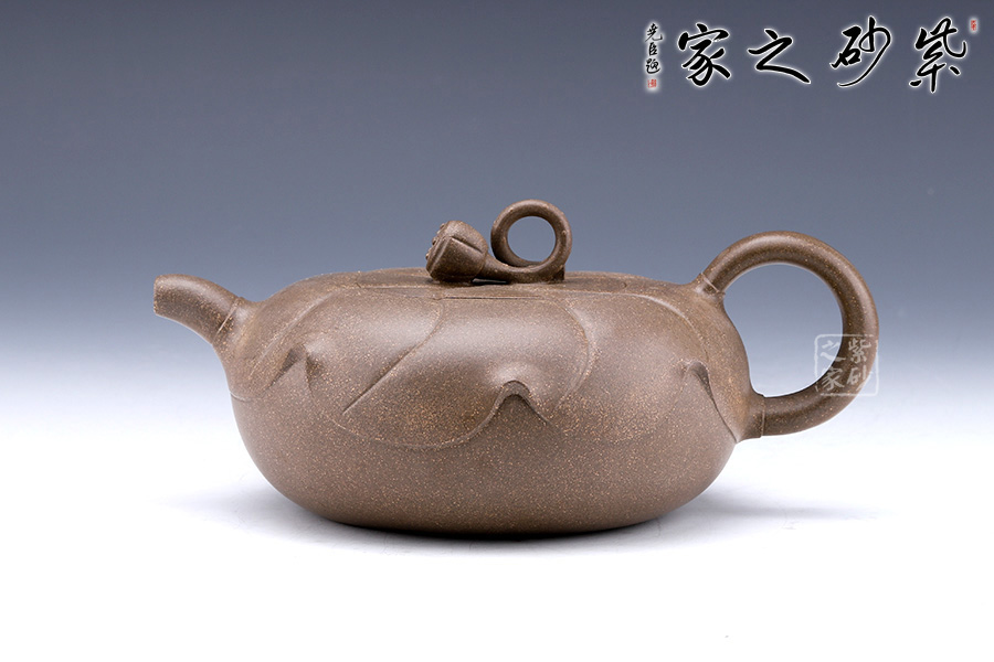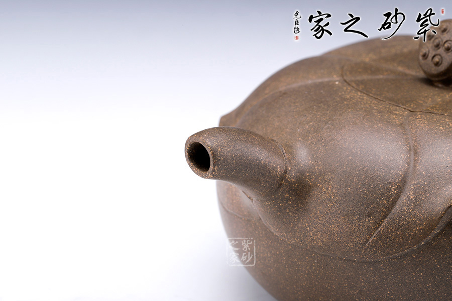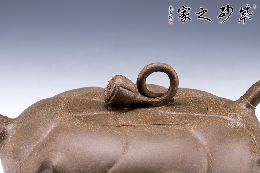 造型如以大而肥厚的荷葉蓋在壺身上,嵌蓋式渾然一體;一支蓮子作鈕,精巧可愛,觀之一股清新之氣撲面而來;短嘴耳把,均裝于壺身的上沿,兩相呼應。