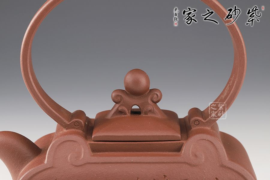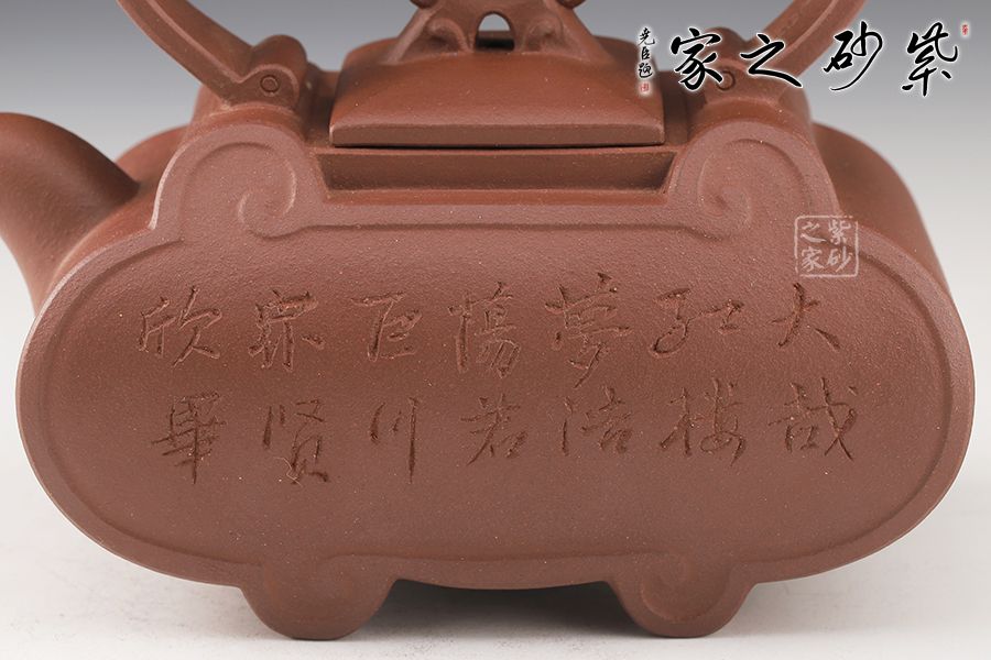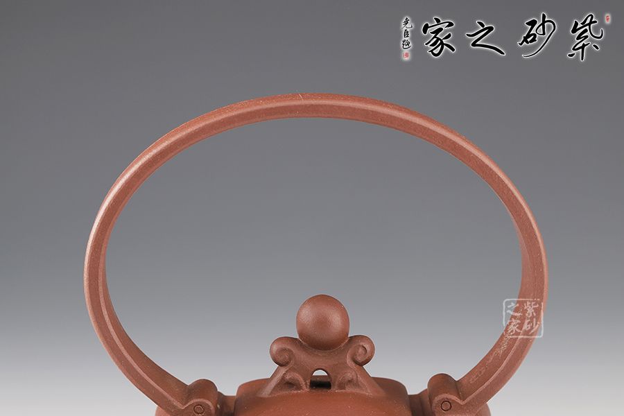 整壺如賈寶玉鑲嵌了通靈寶玉的長命鎖造型,項圈為提梁,鎖上祥云紋樣凸起,頂端為提梁明接處,下端為壺底足,一彎嘴,壺蓋如賈寶玉頭上戴著的束發(fā)嵌寶紫金冠,絨球造型為圓鈕,構(gòu)思精巧,令人贊嘆!