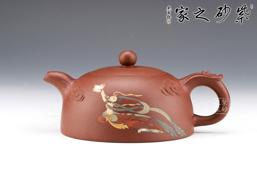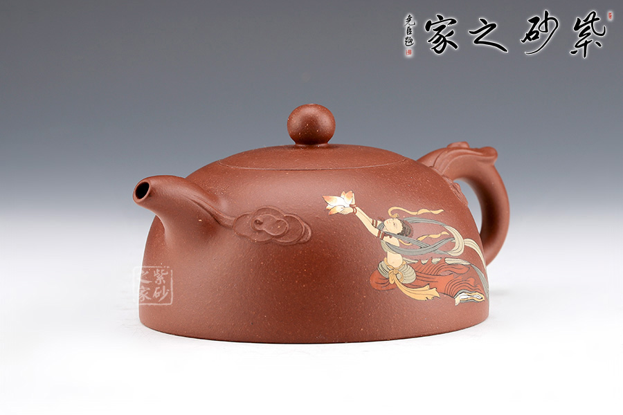 壺身是以半個(gè)月亮為壺型,整個(gè)壺身都十分柔軟溫和,邊緣處都以溫和的弧度過(guò)渡;壺底平整,棱角邊緣線條直率,端莊穩(wěn)重;壺面采用刻繪工藝裝飾,嫦娥手棒玉兔緩緩升天,姿勢(shì)優(yōu)美、動(dòng)態(tài)有力;壺把、壺嘴均已祥云裝飾,寓意吉祥;壺鈕珠圓玉潤(rùn),截蓋設(shè)計(jì)十分嚴(yán)謹(jǐn),嚴(yán)絲合縫,整個(gè)壺渾然一體,協(xié)調(diào)一致,同時(shí)滿足了實(shí)用要求。