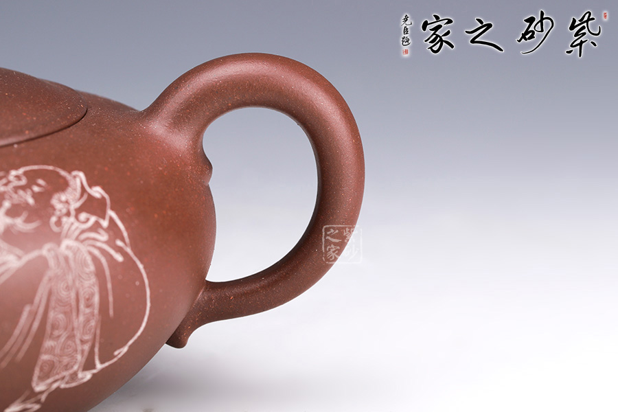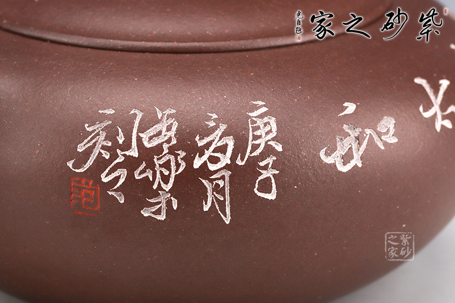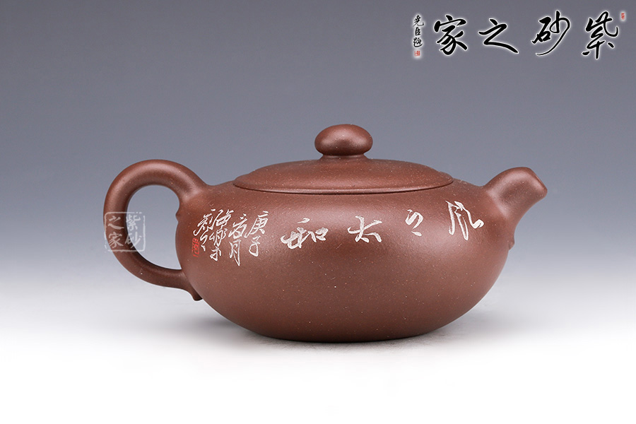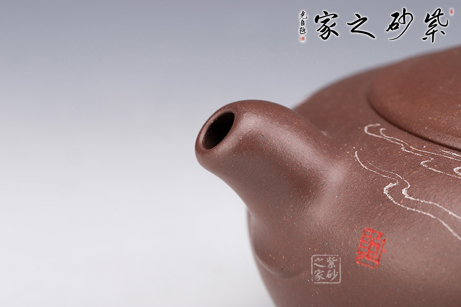飲和器型沉穩(wěn)自在,線條流暢自然,工藝精巧。壺身上豐下斂,壺嘴短且粗大,壺鈕彎曲有型。嵌入式壺蓋略高于壺口,圓線清晰分明;壺鈕帶頸,圓潤豐盈。整器沉著而不張揚(yáng),均勻而又飽滿。作者自制自銘,繪刻技藝精湛,實(shí)為難得佳作。