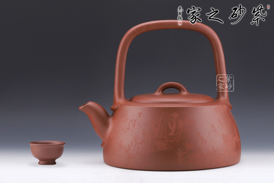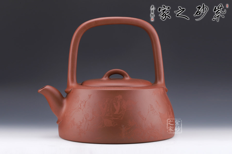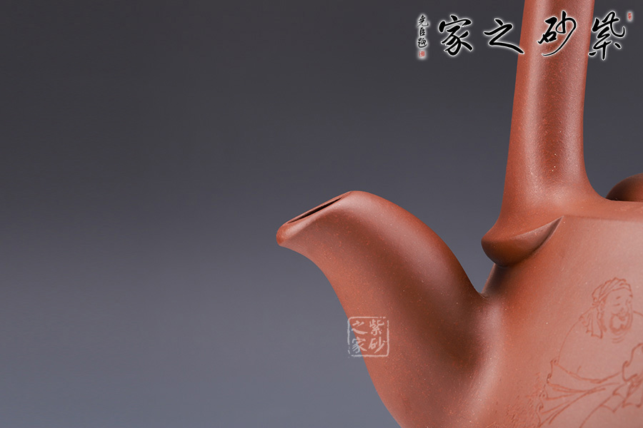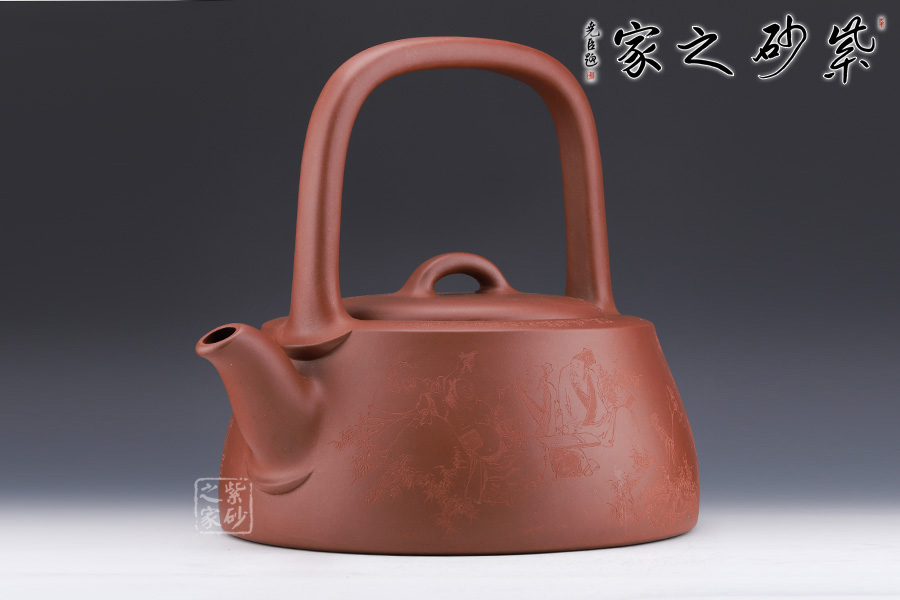 此壺名為“曼生提梁”是曼生十八式中重要器形形制之一,也是各個藝人爭相仿效的經(jīng)典壺型之意。壺身呈半圓柱形,圓中寓直,直中寓曲,耐人尋味。壺面雙面刻繪,正面幾個詩人談天說地,好不自在;反面刻繪詩詞,刀工細膩。梁硬朗而不失柔潤,與壺身的銜接舒坦自然,彎流出水流暢。