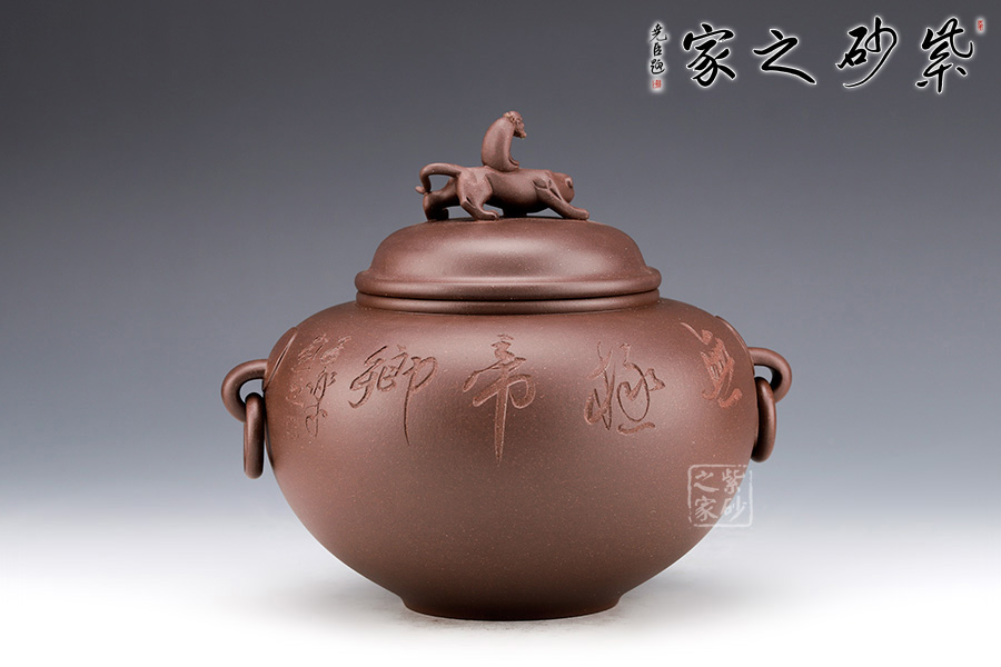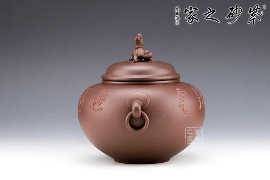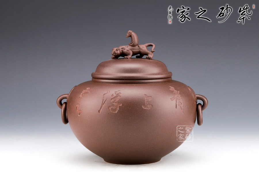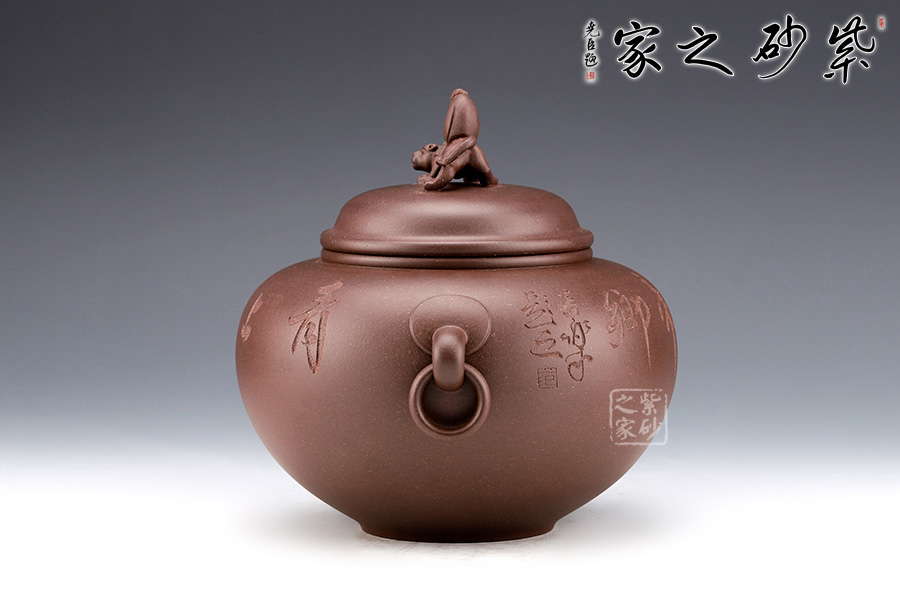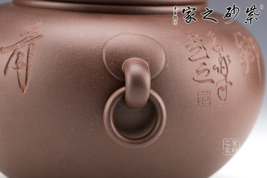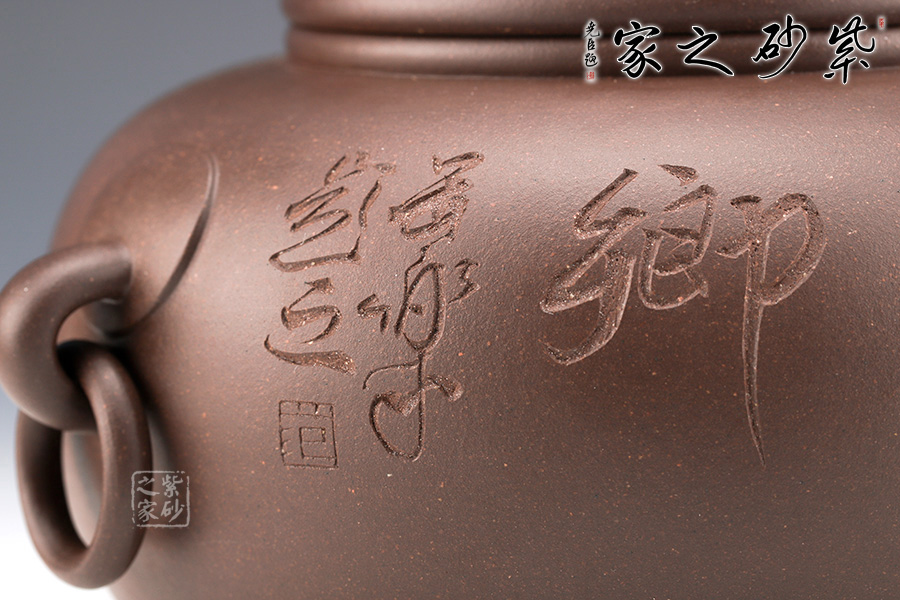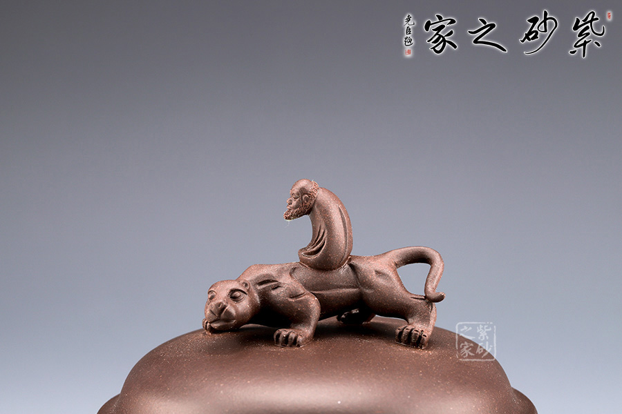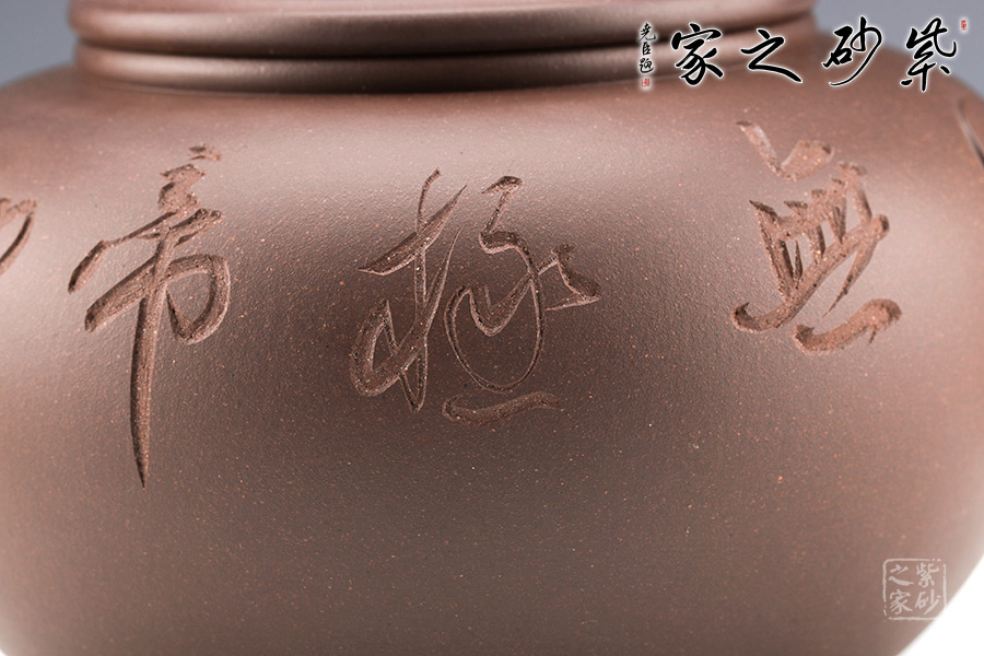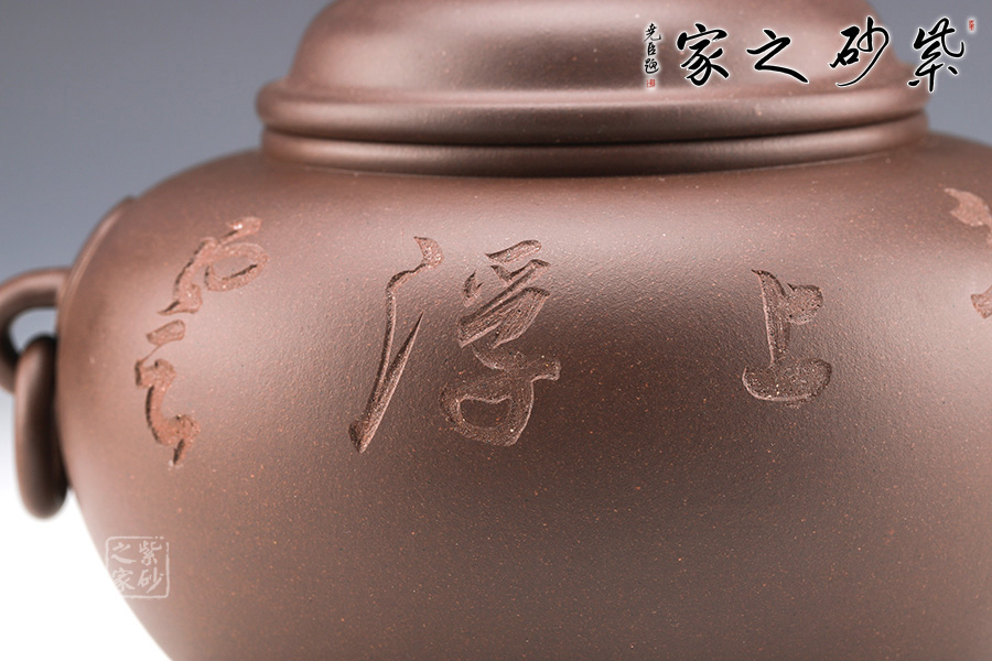 范小君老師制作的這款“青葉菩提”采用紫泥制作而成,色澤古樸,端莊大氣。 罐身似青銅器,圓潤飽滿,線條優(yōu)美流暢。兩側(cè)環(huán)形把手,精致小巧,制作工藝難。罐鈕為伏虎羅漢,制作精細(xì),寓意非凡。 此外,罐身老師手工雙面刻繪,正面“青上浮云”,反面刻繪“無極帝鄉(xiāng)”。