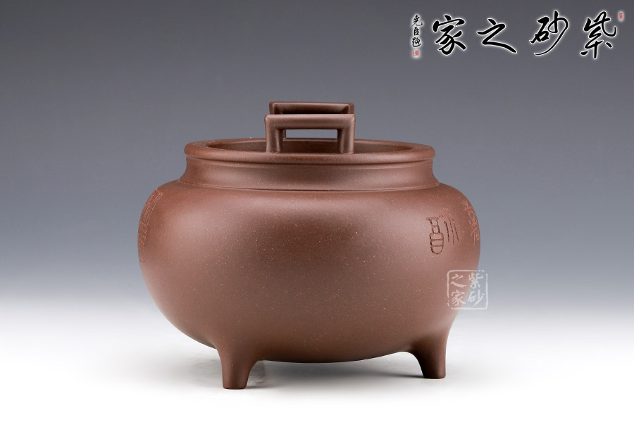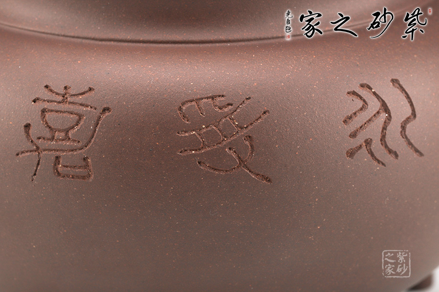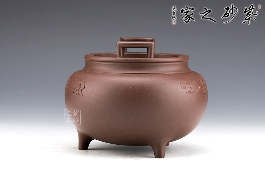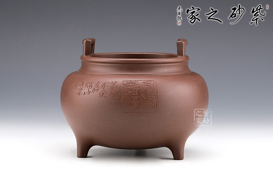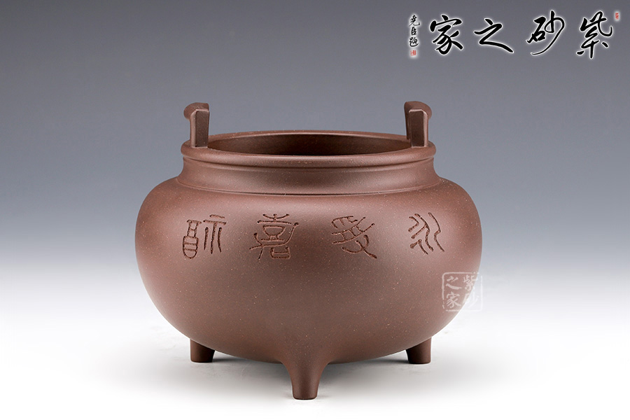 范小君老師的“永受嘉福香爐”采用紫泥制作而成,色澤古樸,端莊大氣。整器仿制青銅器,半球型爐身,下承三足,整件香爐造型古雅,頗有風(fēng)韻氣度。詞庫是與蔡海平老師合作,刻繪“永受嘉福”。