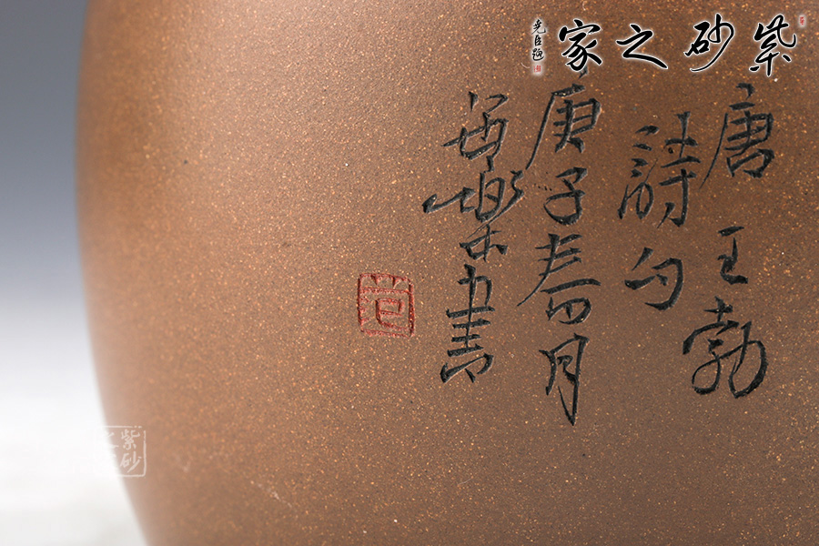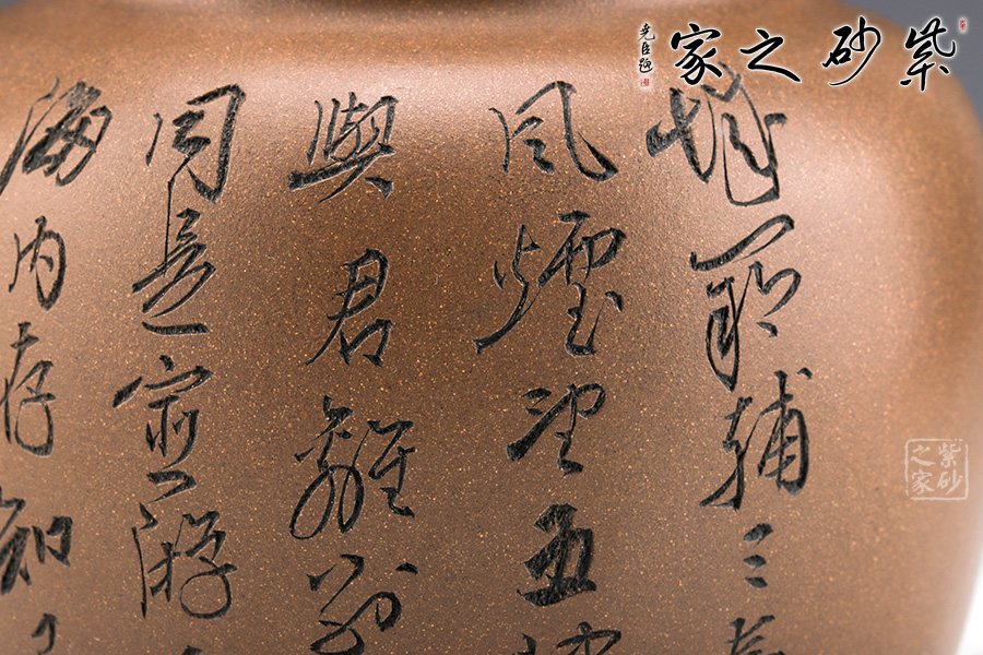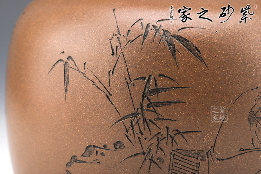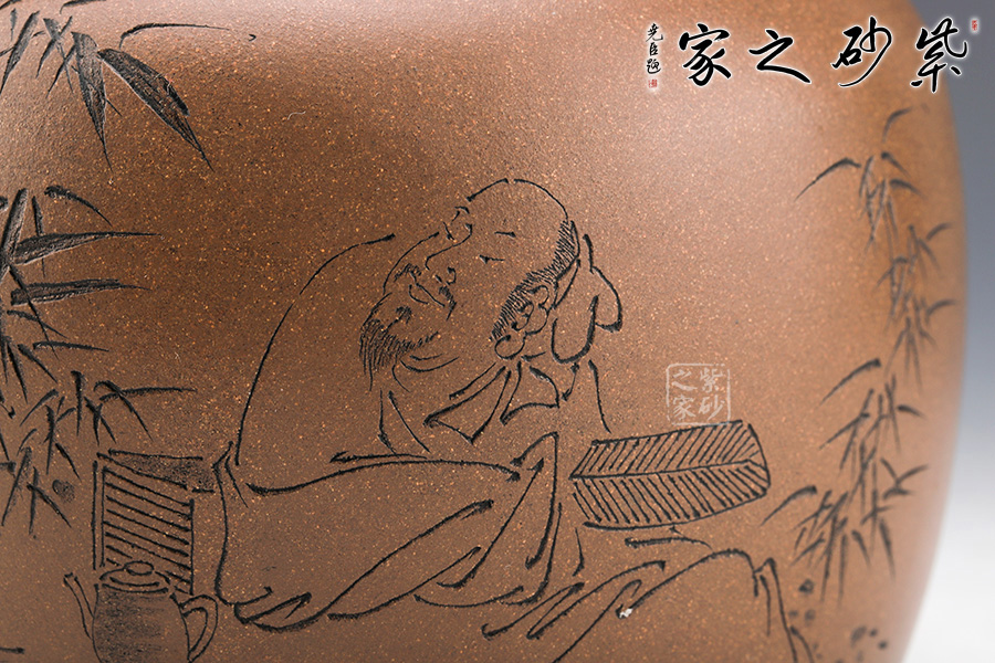 此罐乃是范小君自制自刻而成,罐身呈圓柱狀,線條流暢??谏w處一輪圈線,層次分明。 罐身雙面刻繪,正面刻繪一詩人正在讀書,寥寥幾筆刻畫精細(xì);反面刻繪“送杜少府之任蜀州”。城闕輔三秦,風(fēng)煙望五津。與君離別意,同是宦游人。海內(nèi)存知己,天涯若比鄰。無為在歧路,兒女共沾巾。