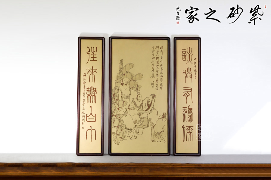 此款雅集中堂采用紫泥+段泥制作而成,中堂:寬45cm,高87cm,對聯(lián):寬19.5,高87cm,老師自制自銘,僅此一件,喜歡的壺友可以盡快入手,錯(cuò)過無!