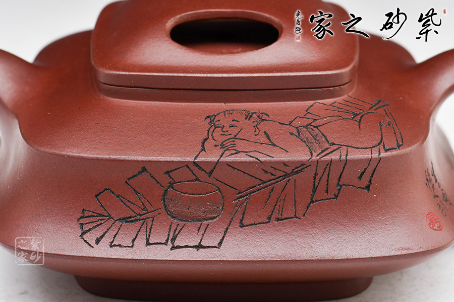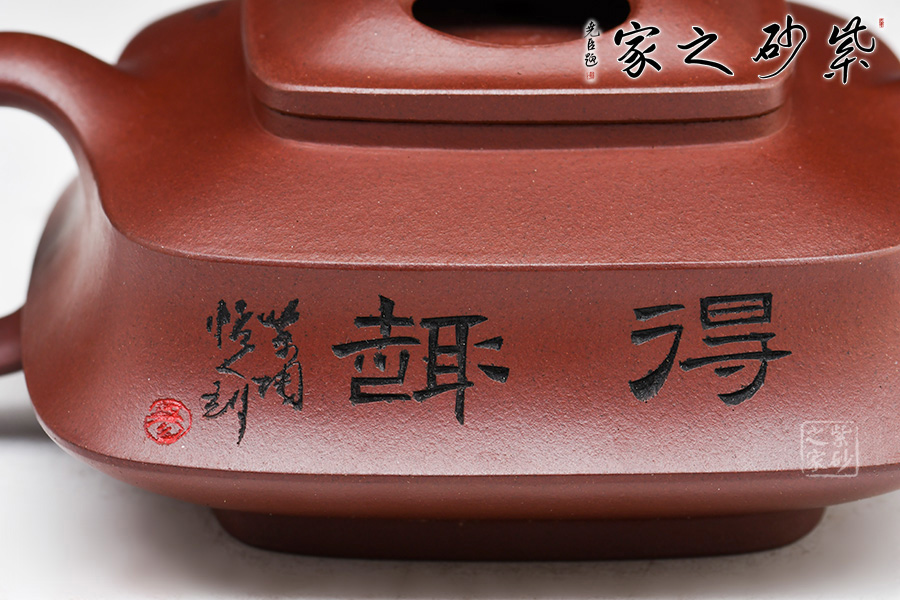此作品乃是一個四方牛蓋套壺,選用老紫泥制作而成,色澤亮麗。楊瑤芬老師自制自銘,做工精細。