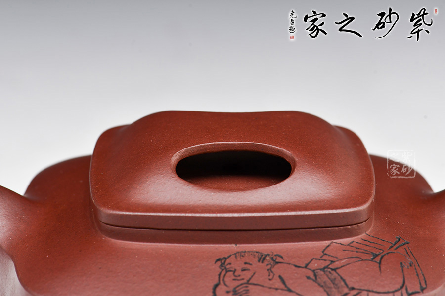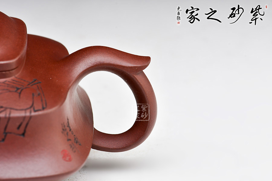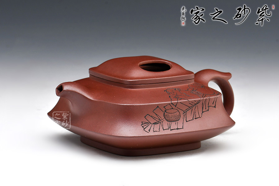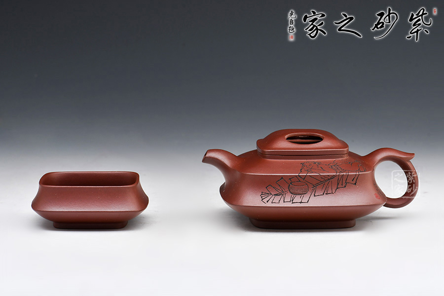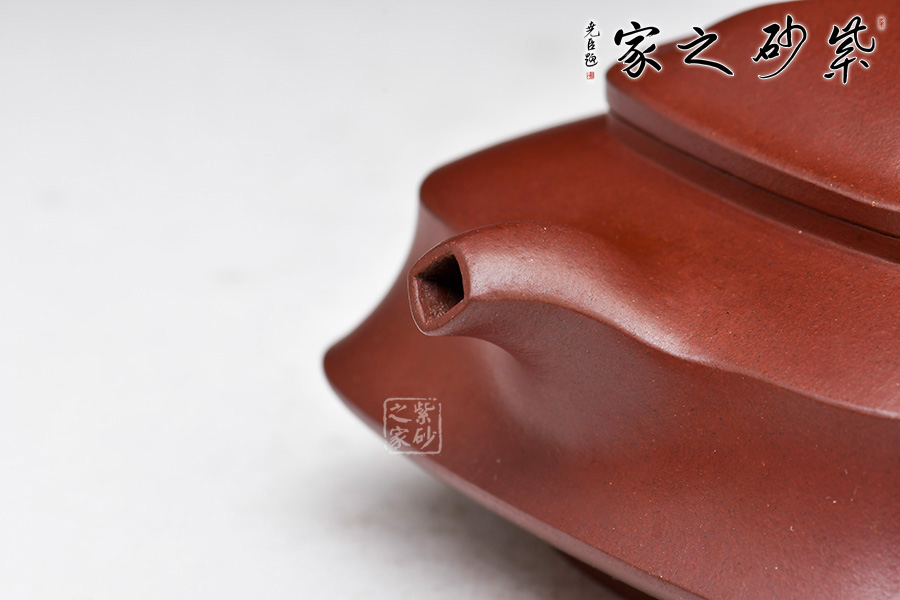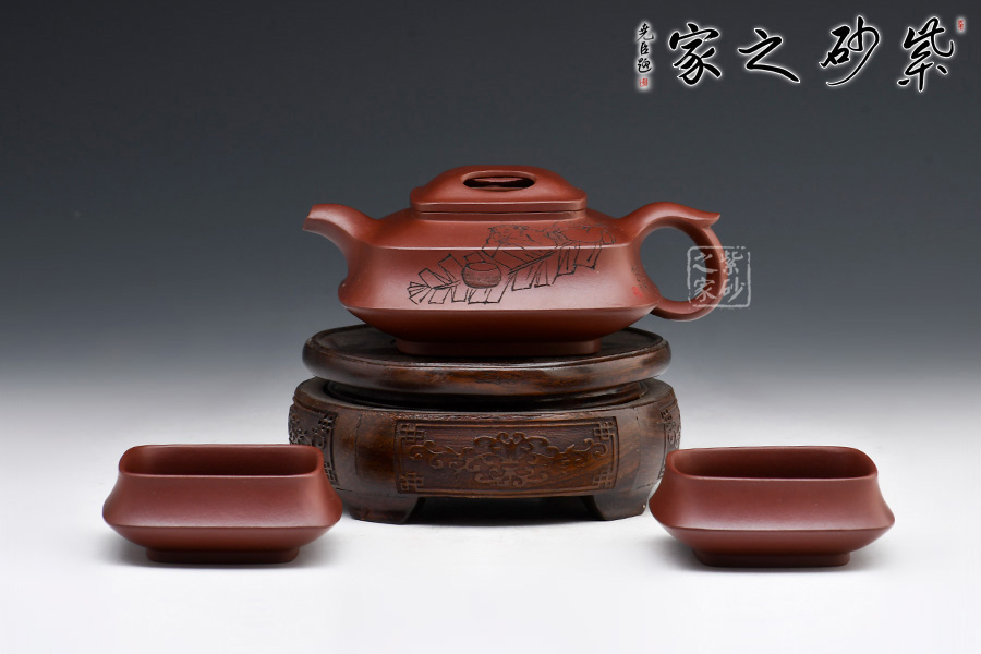 壺身為四方,面面俱到,下延至釘足,沉穩(wěn)內(nèi)斂。壺蓋做的很精致,壓蓋與壺口緊密結合,口蓋整體平整光滑,外形流暢;壺鈕制作別出心裁,采用了牛鼻孔式的鏤空結構,生動與趣味精美結合。 一彎短嘴出水流利,飛把自然大方。此外,兩個杯子似性質(zhì)似壺身,兩兩相呼應,十分具有趣味性。