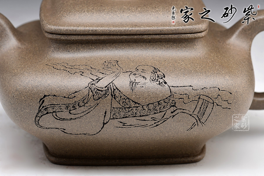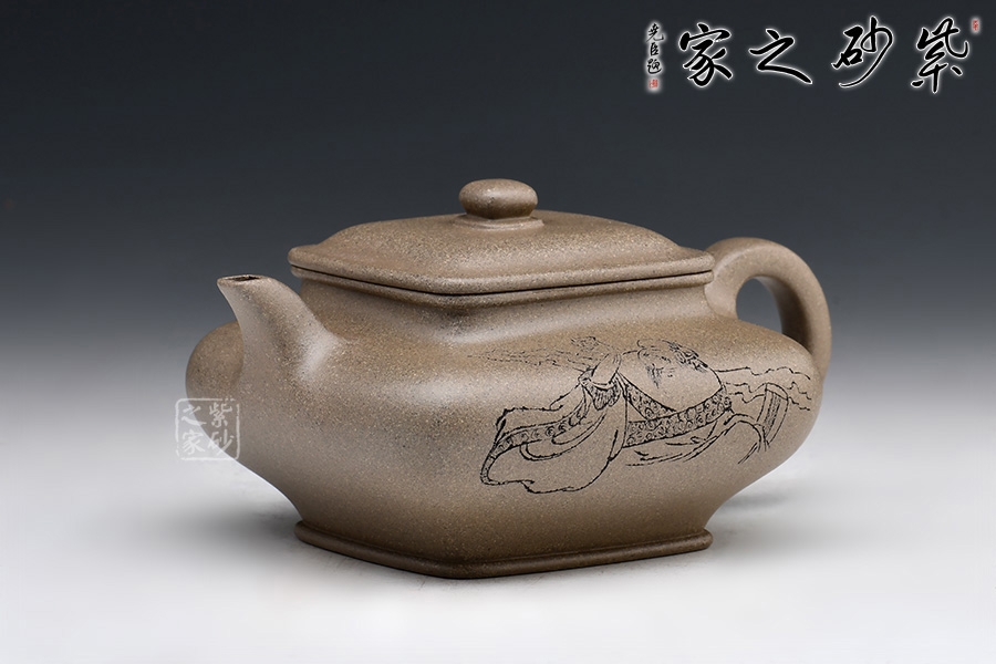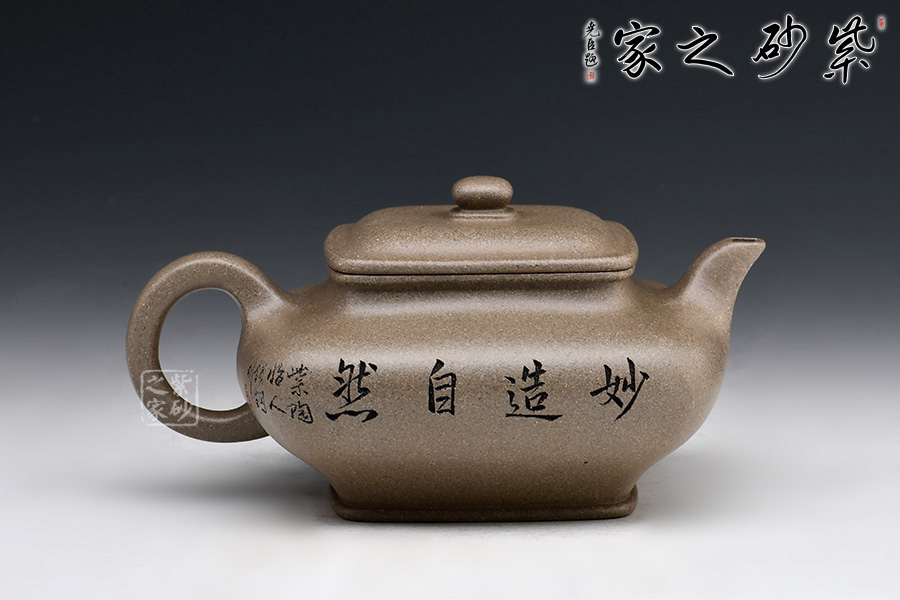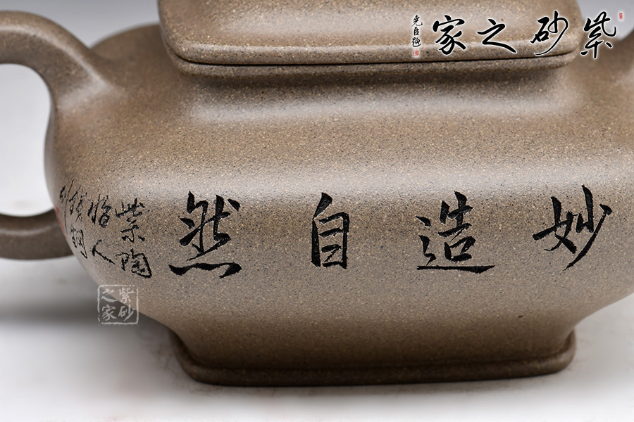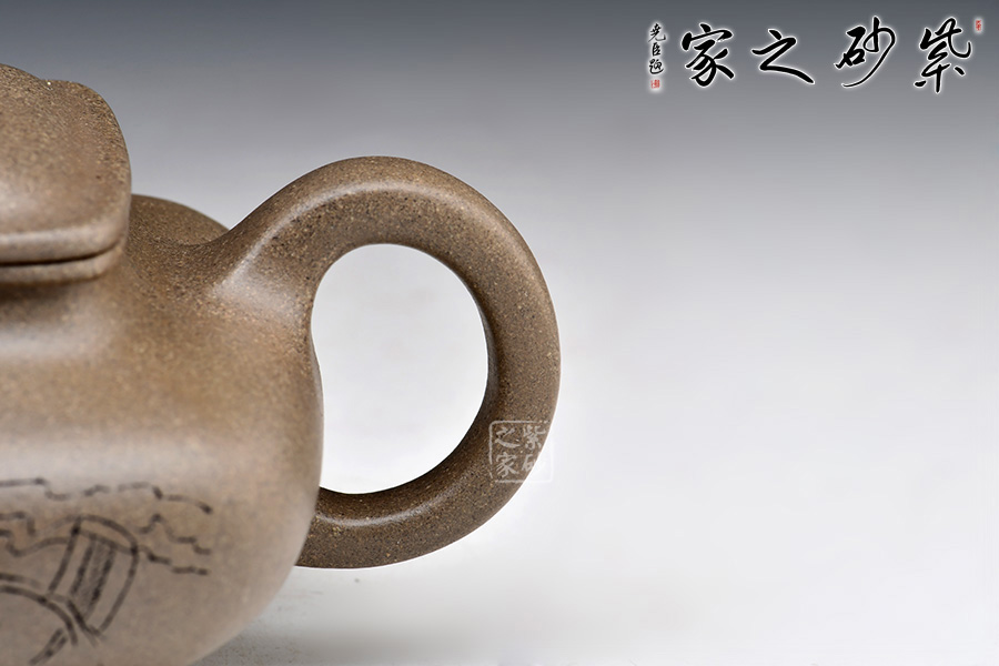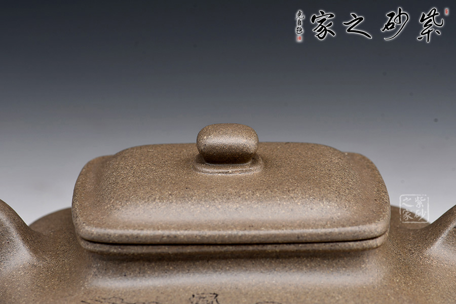 “四方”造型,最能體現(xiàn)出“端莊”的氣質(zhì);“虛扁”,其扁圓的器型給人一種虛懷若谷、逍遙自在的感覺。此壺線條流暢,型體和諧,壺感深厚且具神韻,視覺效果舒適,方圓結(jié)合虛實之間和諧共存,處處都體現(xiàn)作者技藝之精湛。