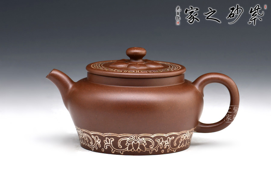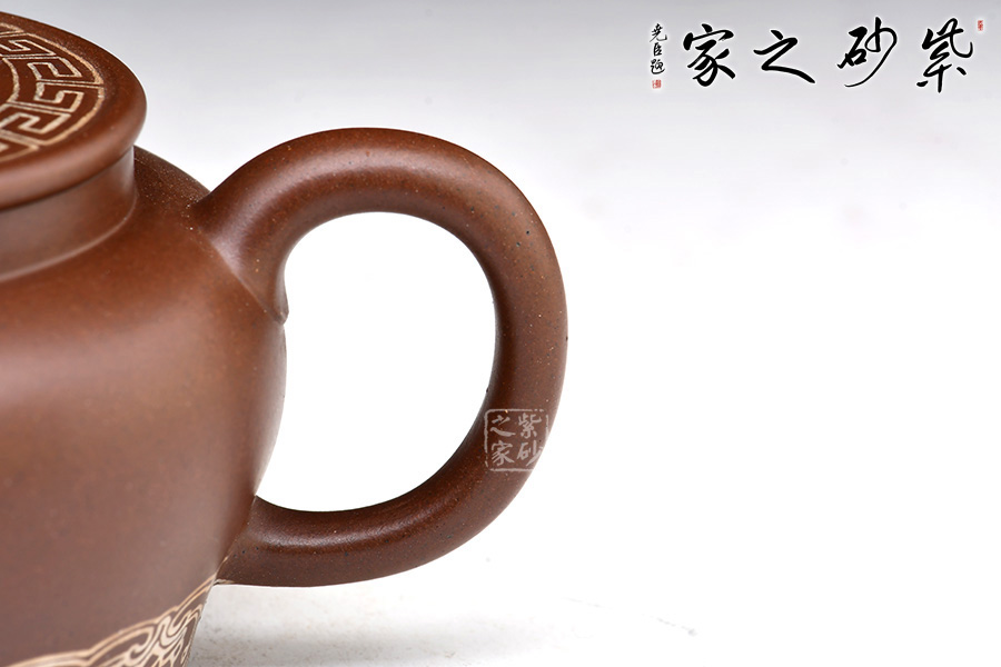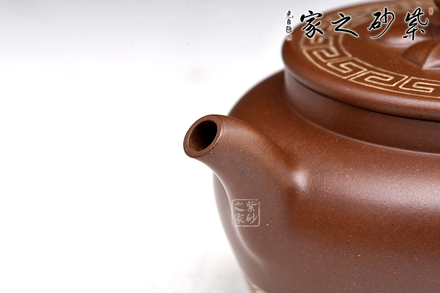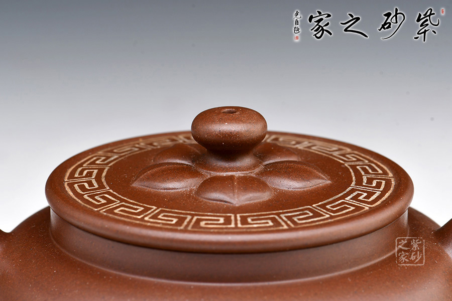 壺身圓潤,線條流暢;耳形圈把甚是有力,拿捏適手。直流嘴,獨孔炮管直流,出水極快,極為爽利;壺頸略高,氣勢挺拔;壓蓋設計嚴絲合縫,裝飾回紋,十分漂亮;壺鈕似花蕊,鈕周圍加入花瓣設計,構(gòu)思十分巧妙。