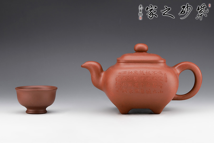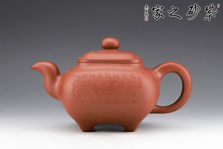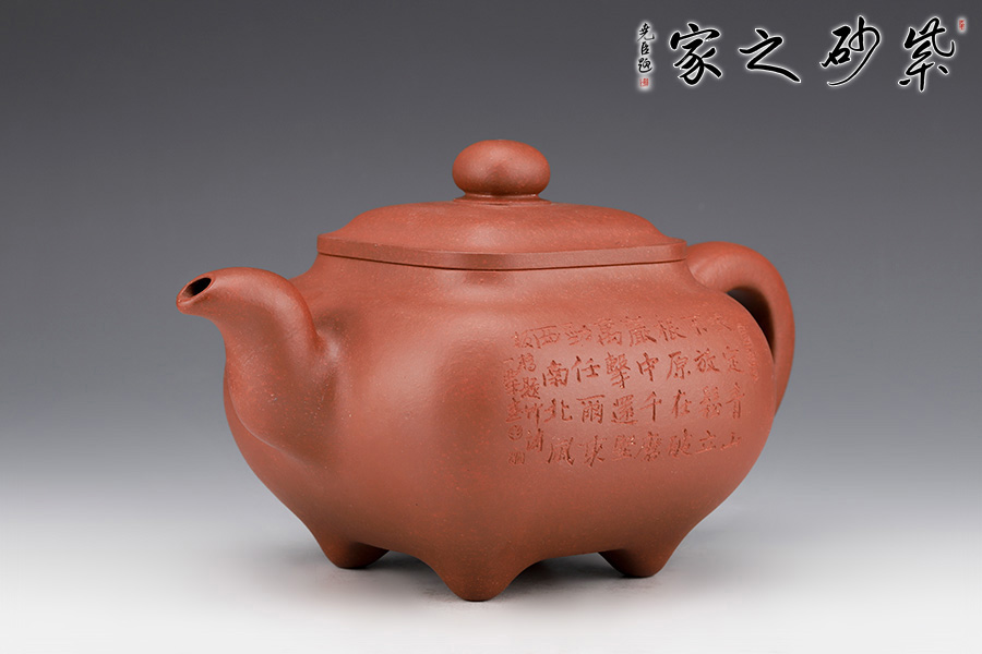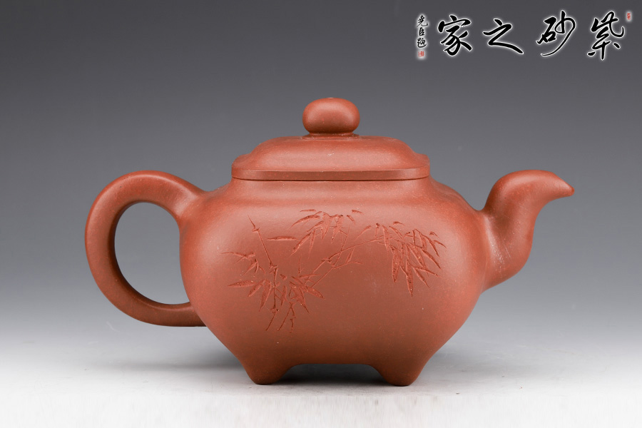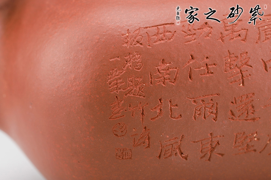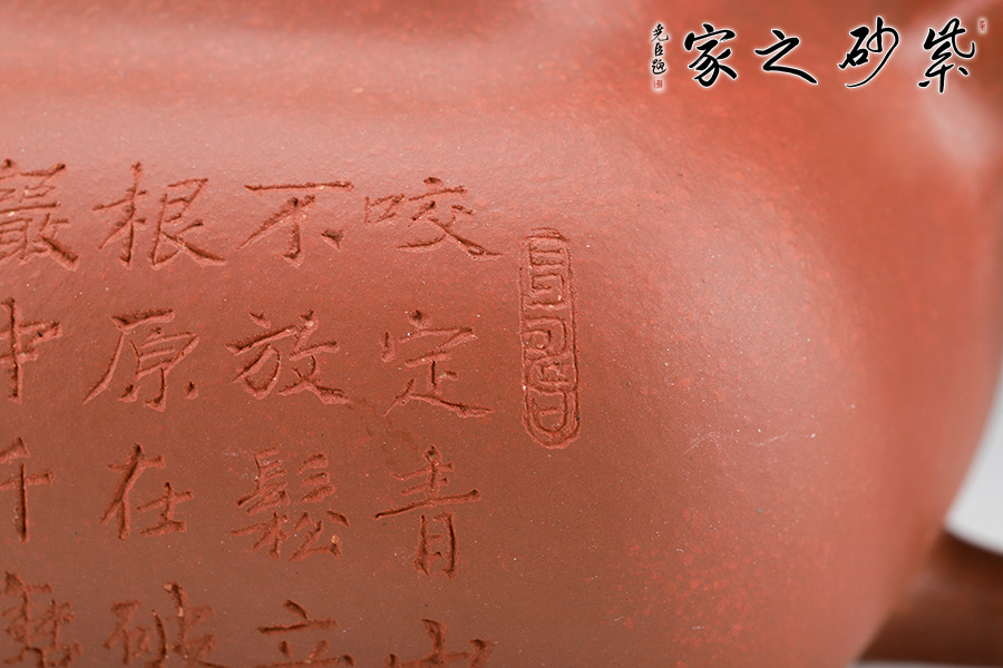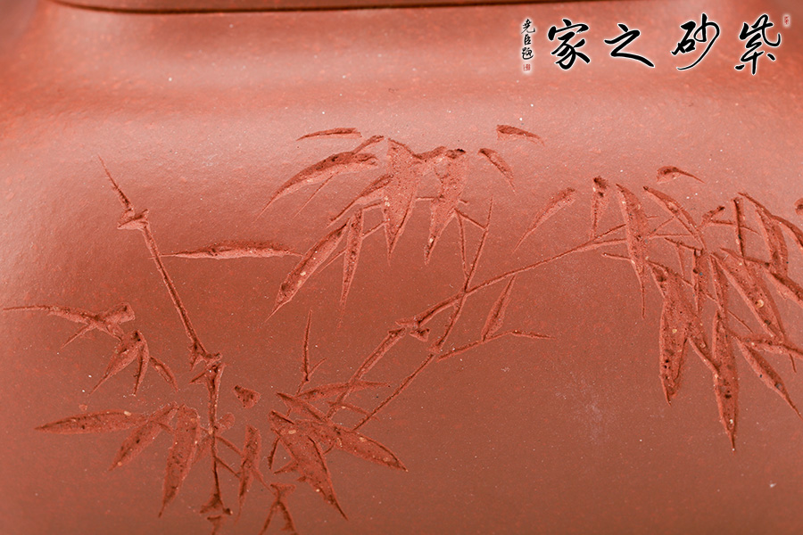 壺身形狀為方形,但方中帶圓,圓里寓方,韻味十足。壺嘴的造型難度非常高,三彎嘴曲折有致,出水自然流暢。壺蓋延續(xù)了全器造型特點,方型圓角,壓蓋形式,制作精良且面面俱到。底足皆采用四顆“釘足”形式,且多屬短柱型,精巧別致,落地穩(wěn)重。壺身的刻繪更是精美絕倫,正面石毛國強老師刻繪的竹子,反面是毛國強老師親手刻繪的一首贊竹名詩《竹石》,雙大師聯(lián)合制作,收藏價值非常高。