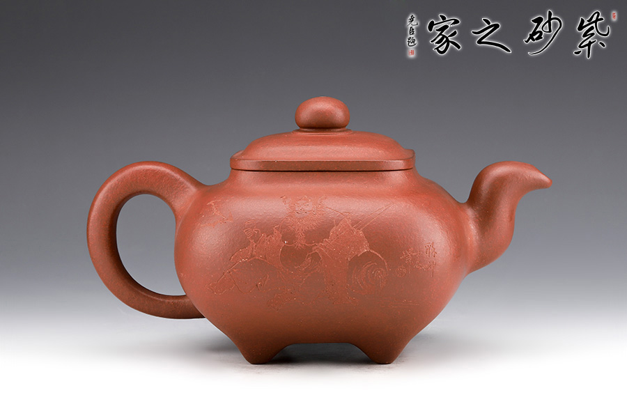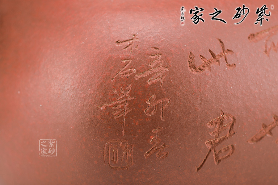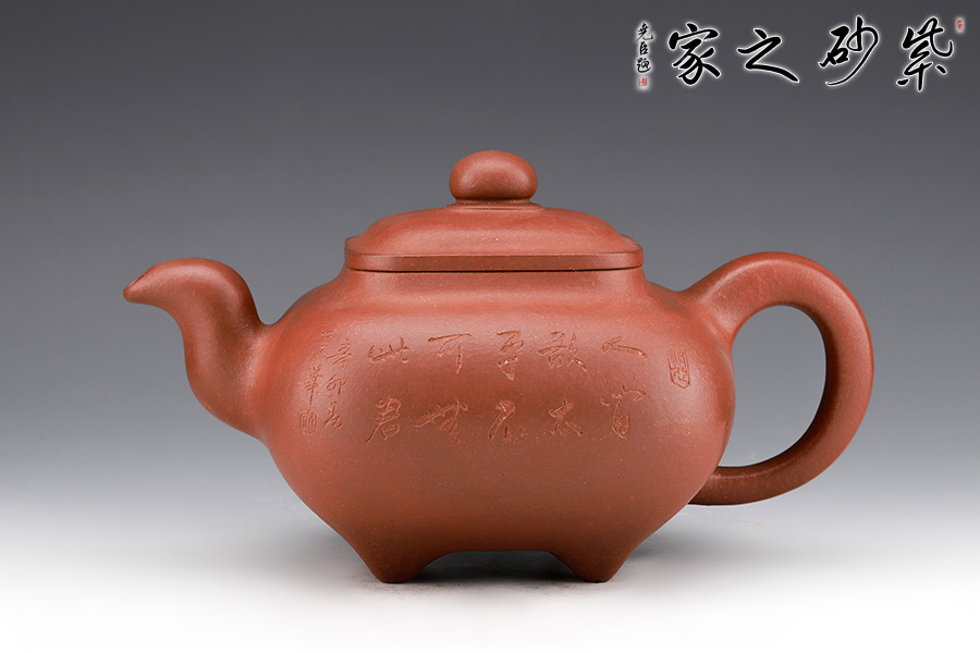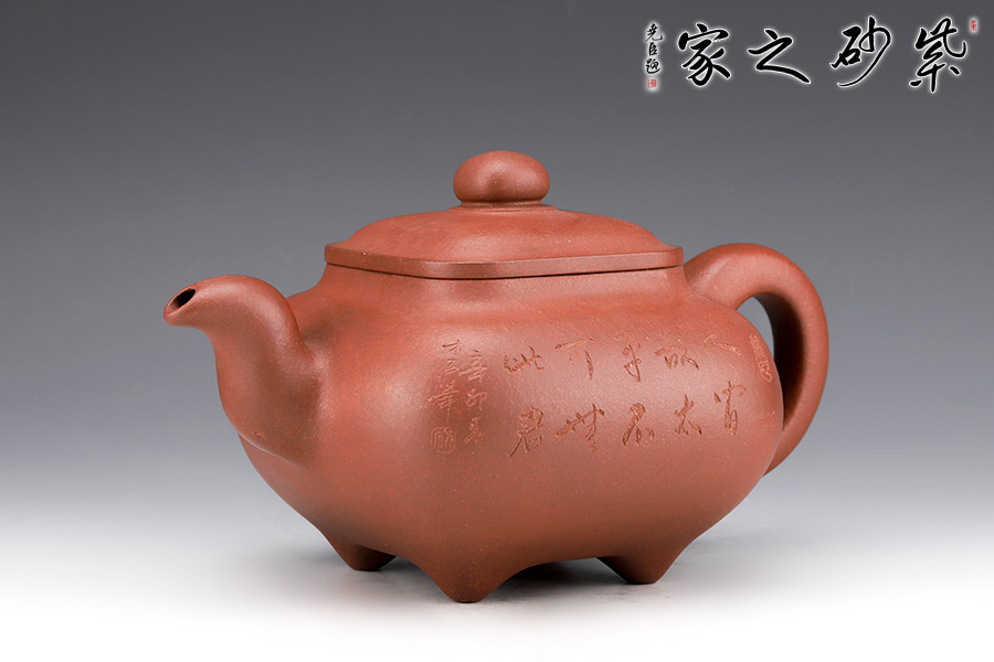 壺身形狀為方形,但方中帶圓,圓里寓方,韻味十足。壺嘴的造型難度非常高,三彎嘴曲折有致,出水自然流暢。壺蓋延續(xù)了全器造型特點,方型圓角,壓蓋形式,制作精良且面面俱到。底足采用四顆“釘足”形式,且多屬短柱型,精巧別致,落地穩(wěn)重。壺身刻繪精細,刻有”人間欲太平,不可無此君“的詩句,意境唯美,仿佛這不是一把壺,而是一尊爐,十分傳神。