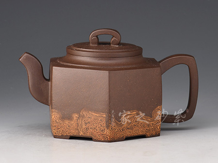 長于絞泥,自學(xué)藝起就專制雙面絞泥:普通絞泥是單面的,只有壺體外側(cè)有花紋;陸利華的絞泥在壺體內(nèi)側(cè)、外側(cè)都有同樣清晰的花紋。以工藝難度論,紋路清晰的絞泥難于不清晰的,花紋規(guī)則的難于不規(guī)則的。陸利華一入手,做的就是難度最大的清晰、規(guī)則的絞泥作品。