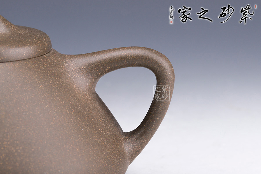 此壺下大上小呈三角形的石瓢形,周身皆以圓弧線條構(gòu)成,嘴、把、的處處銜接自然流暢,線條利落明確,起承轉(zhuǎn)合交待清楚。