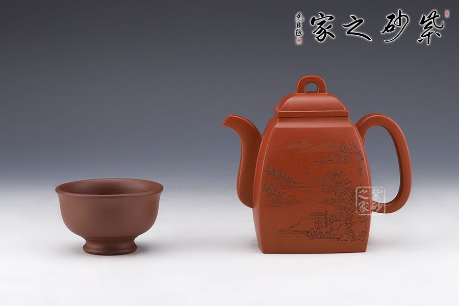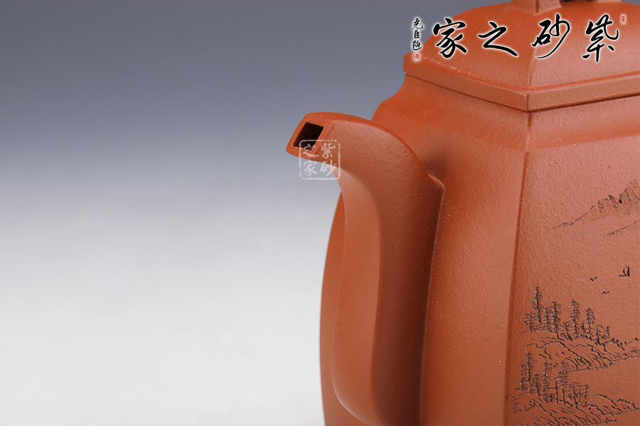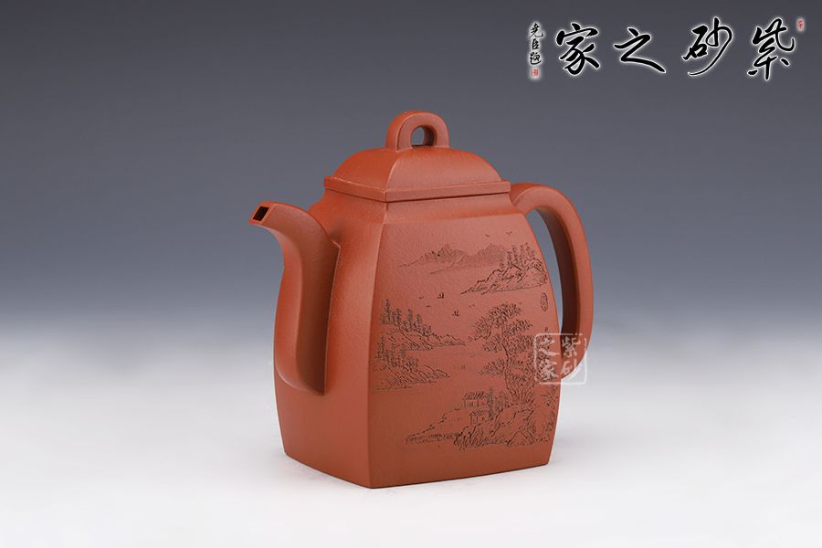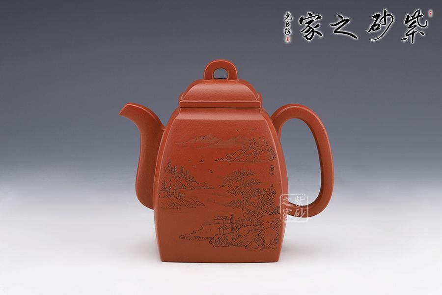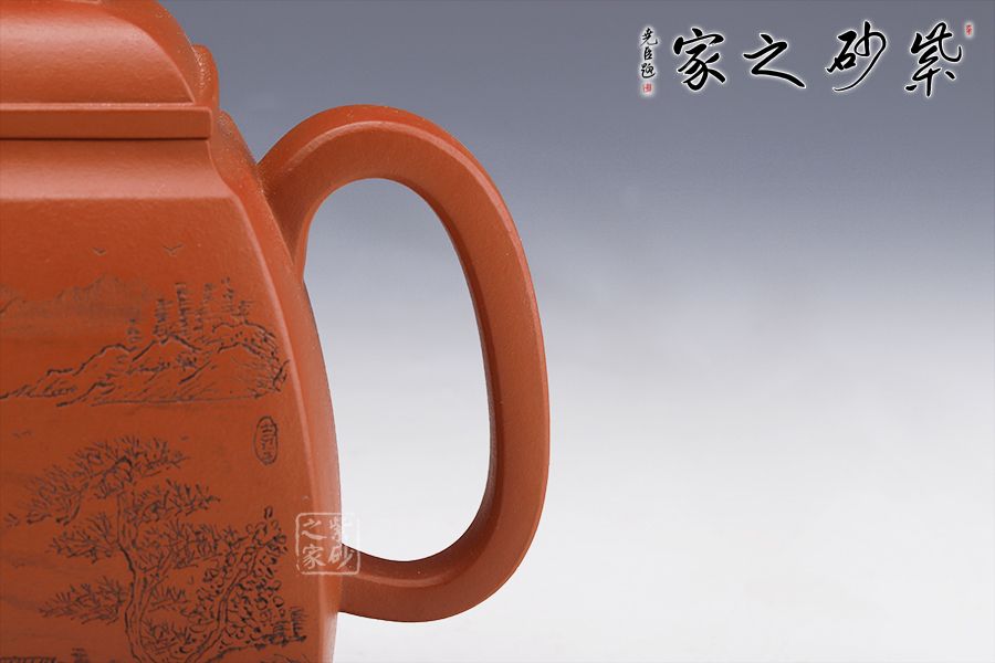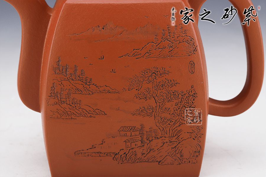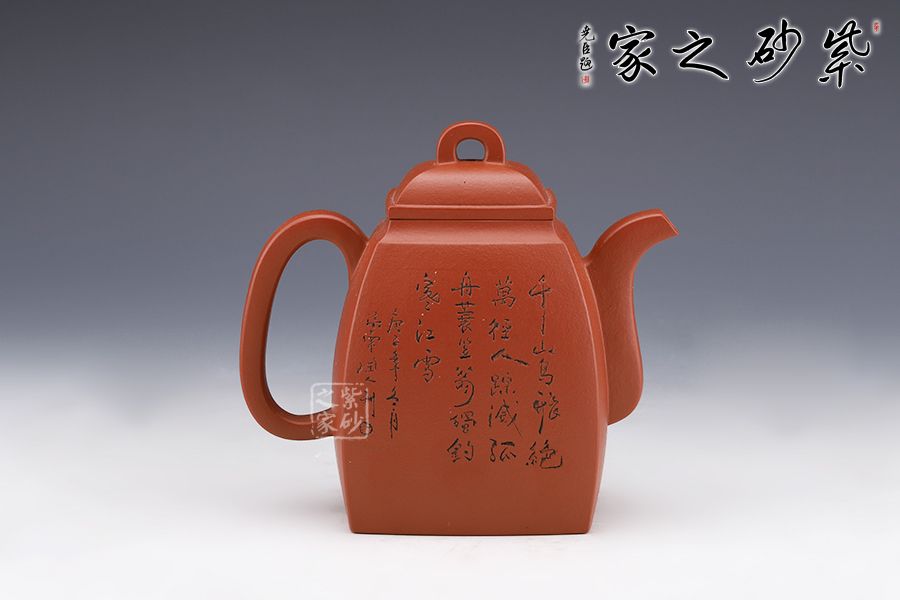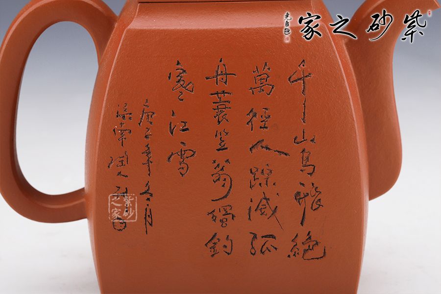 此壺壯碩大氣,呈扁方形體,壺流呈四方狀,并以四分之三平貼壺身,把圈寓方,鈕為橋梁式,蓋身平面皆正方,向下愈來愈闊,壺蓋密壓蓋口吻合。壺身一側刻繪山水圖,另一側刻繪柳宗元的《江雪》。
