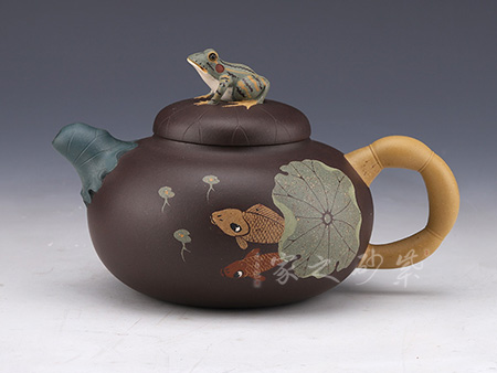 “金魚”與“金玉”同音,內(nèi)在寓意一目了然。壺身主體圓潤溫和,有著圓器的基本特征,大壺蓋內(nèi)嵌于壺口,溜肩順勢延伸至壺身,曲度合理,撫摩手感十分舒適。
