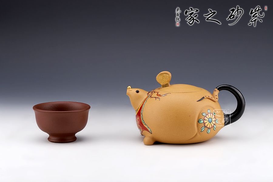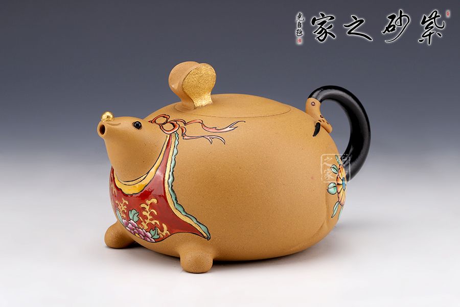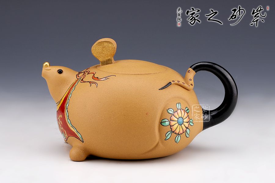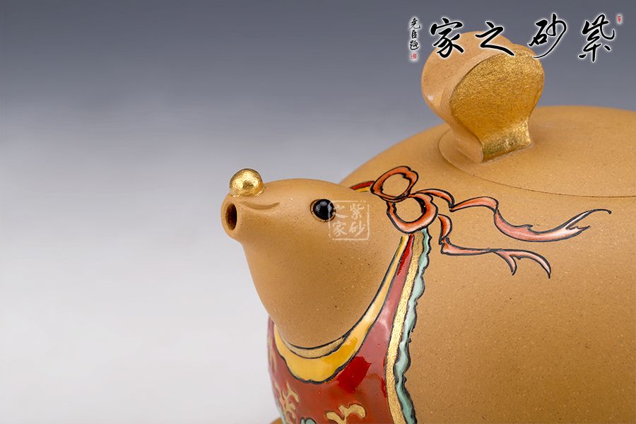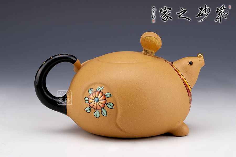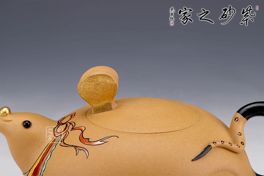 此壺以“?!睘槌霭l(fā)點(diǎn),借一只奔跑的老鼠,配以飄揚(yáng)的彩帶,給人一種鼠到福至的感覺,鼠頭微昂,面露笑容,更添了幾分喜氣。