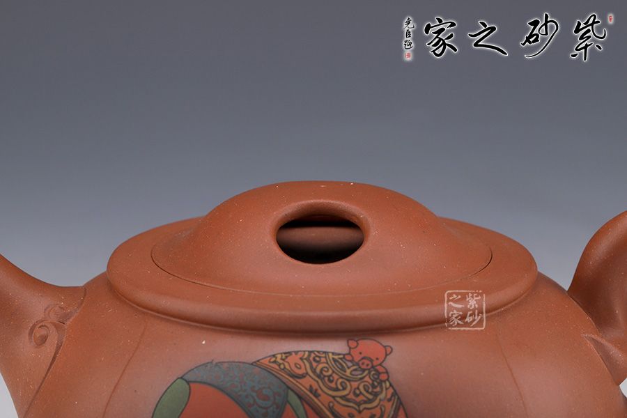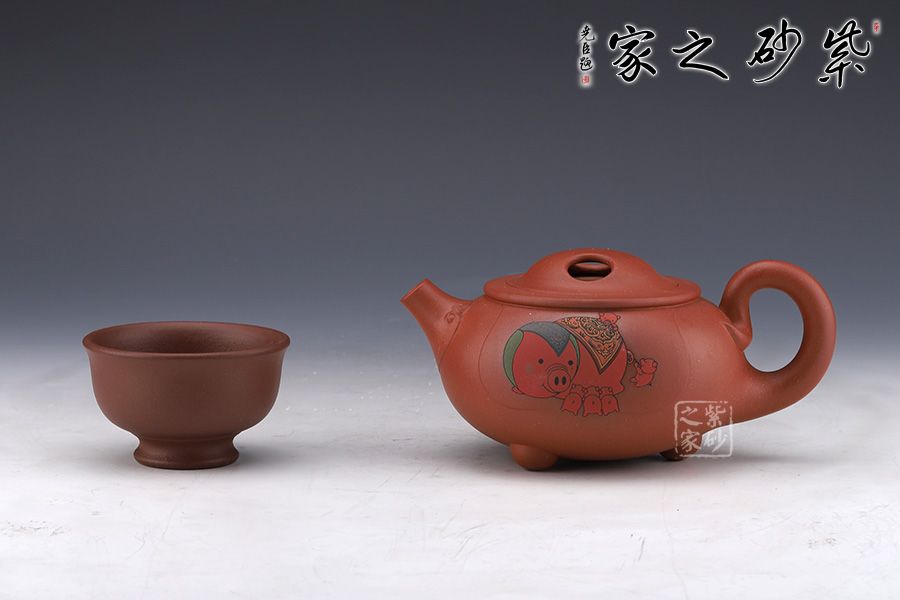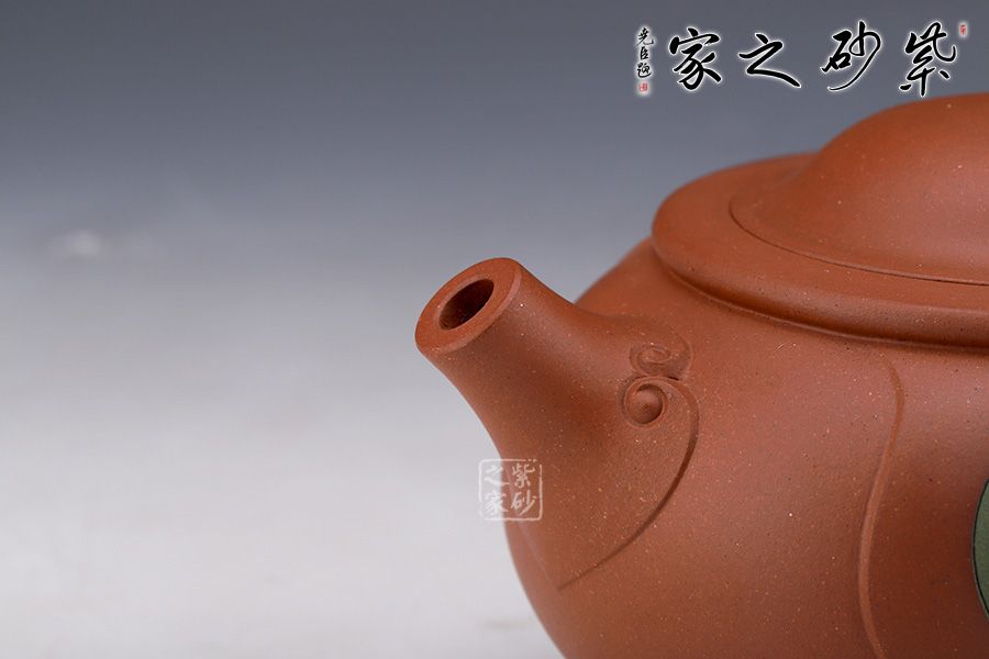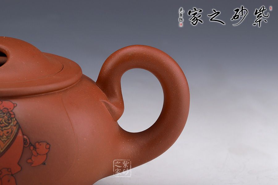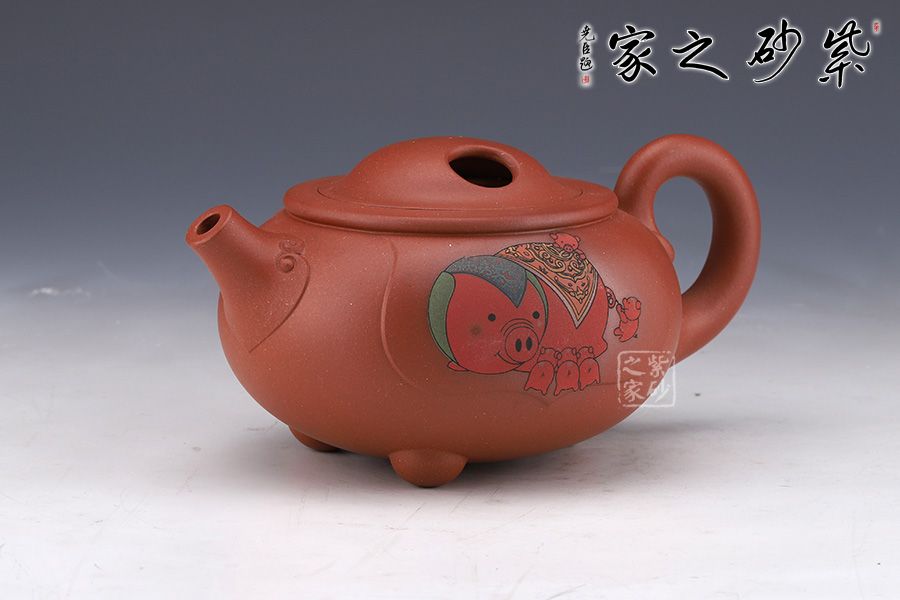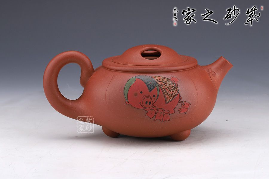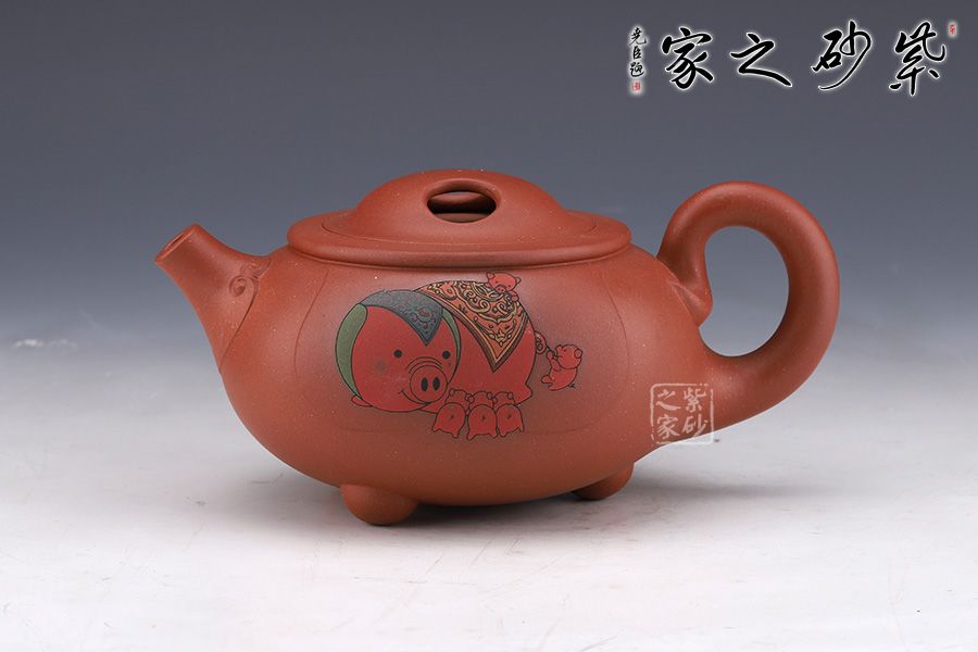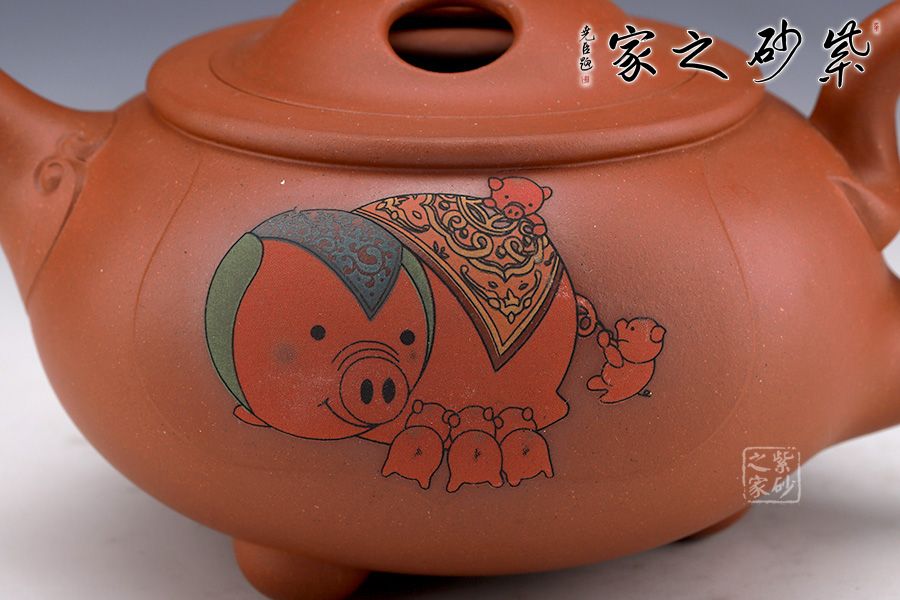 此壺純熟的的手法精工細(xì)作,造型雅致,線條流暢,比例恰當(dāng)。此壺呈扁圓形,直彎流,出水流暢干凈利落。此壺重點(diǎn)在于壺蓋上兩個(gè)對稱的橢圓型孔,壺身多個(gè)小豬圖案,表示福氣滿滿。此壺,值得收藏把玩,推薦!