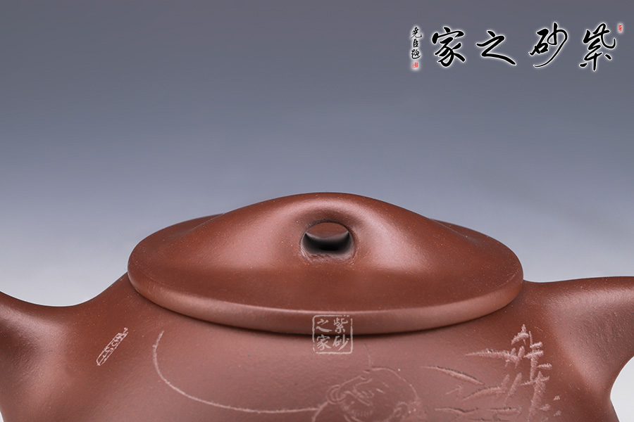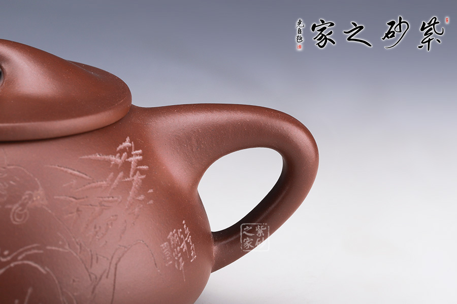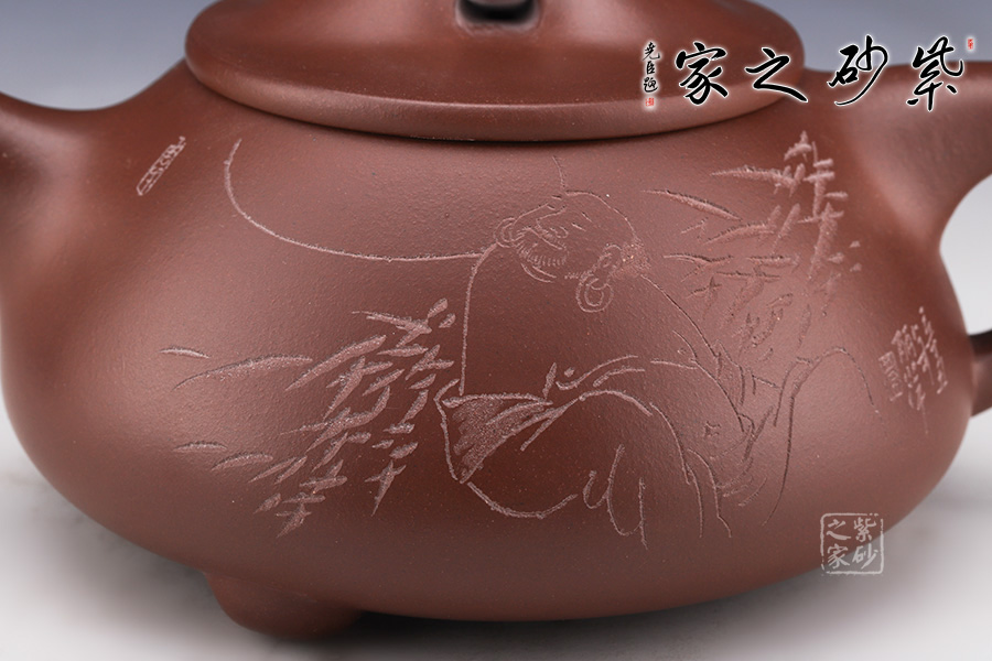 此壺壺身呈梯形,曲線柔和流暢,造型渾厚樸拙。直流壺嘴,出水爽利,流勢(shì)酣暢淋漓,趣味性十足。壺鈕如同一條拋物線連接壺蓋兩端,形如拱橋,拿捏方便,鈕孔形成一個(gè)飽滿規(guī)整的扁圓,足見做工精細(xì)。壺把倒三角把,傳統(tǒng)經(jīng)典,比例得當(dāng)。足為釘足呈三角鼎立狀支撐,給人以輕靈而穩(wěn)重之感。