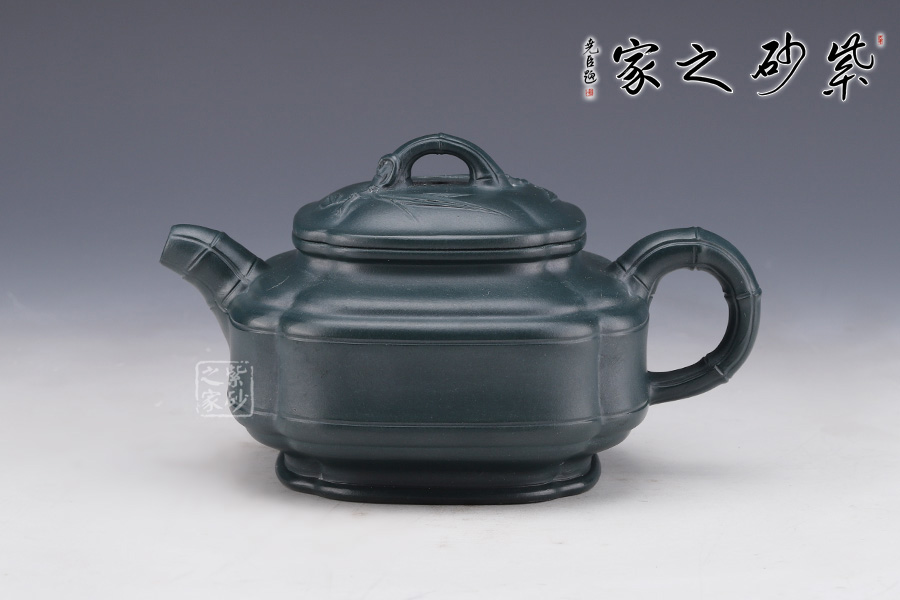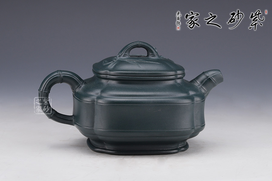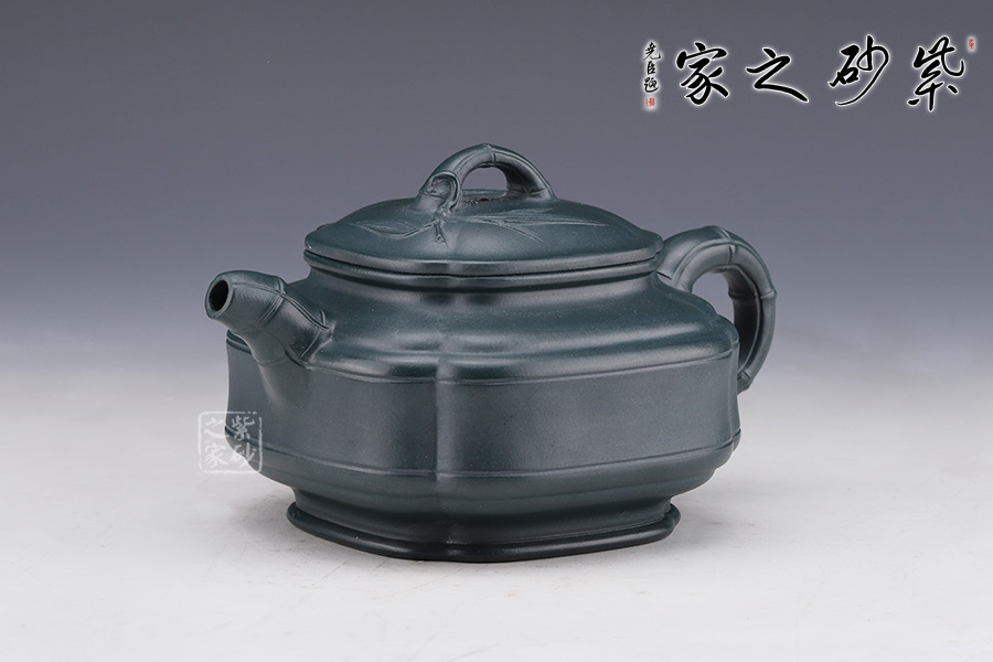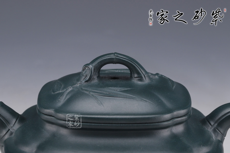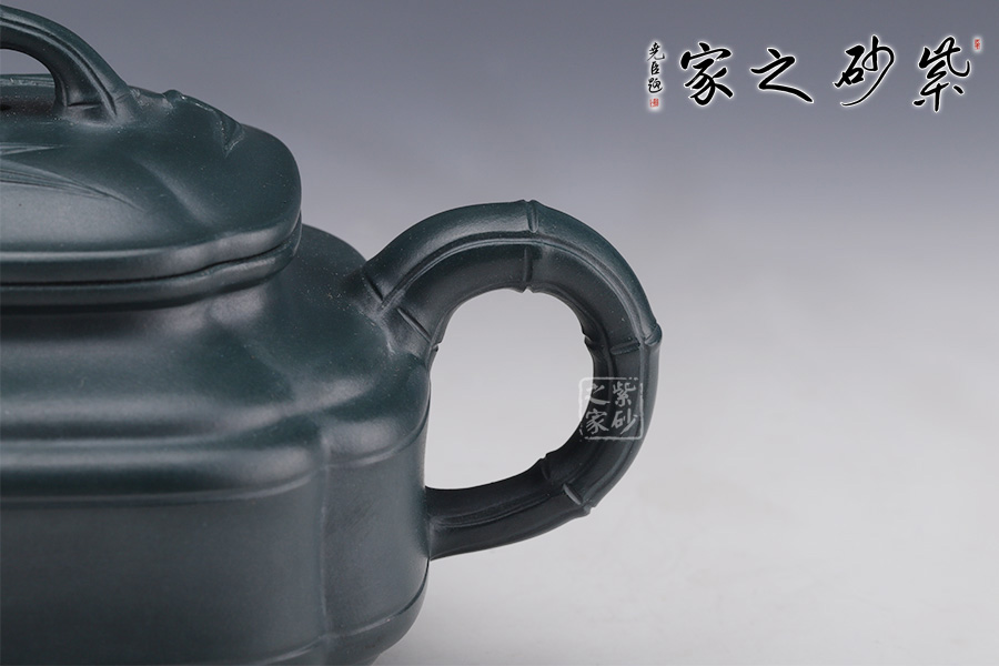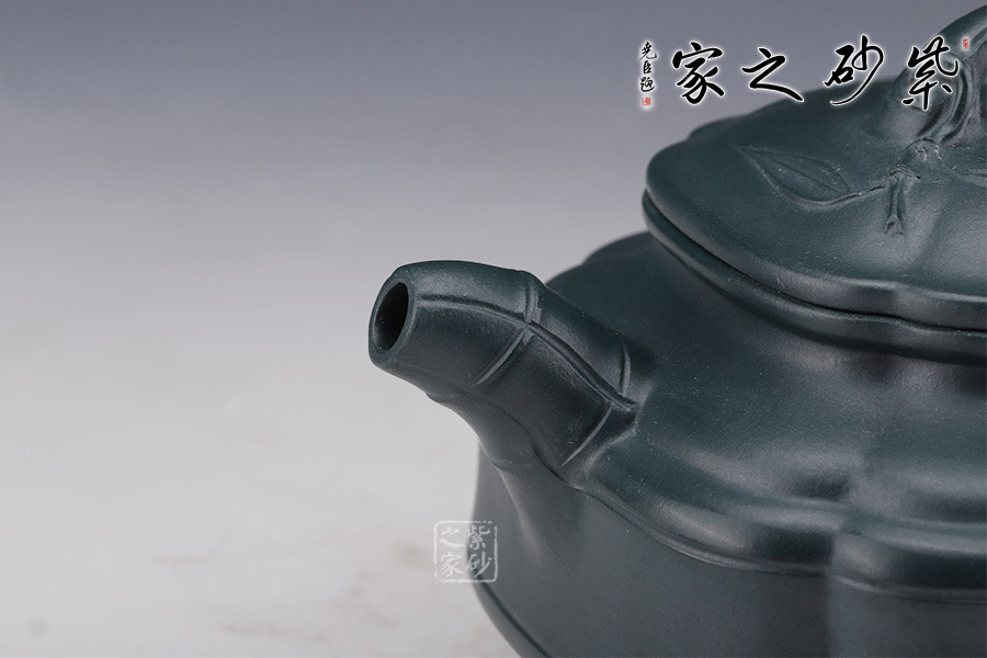 此壺是雙線竹與筋紋的結(jié)合,雙線竹鼓壺是一種傳統(tǒng)壺式,其器形工整,雍容大方。該壺底為圈足,四條筋紋將壺分成等四方,從壺蓋至壺底,似菱花造型,竹形鼓身,壺身雙線,飽滿有力。壺肩部凹陷舒展圓潤,形成端正雅致的氣質(zhì)。一彎嘴、圓把均塑是竹節(jié)造型,節(jié)節(jié)清晰,逼真自如;長頸,口蓋子母線,虛蓋相配;蓋上堆塑屈曲的竹枝為橋鈕,嫩枝抽出,生動有力。整器用線條作為壺體的裝飾,表達出秀逸、剛?cè)嵯酀?、豐滿厚實的氣韻。