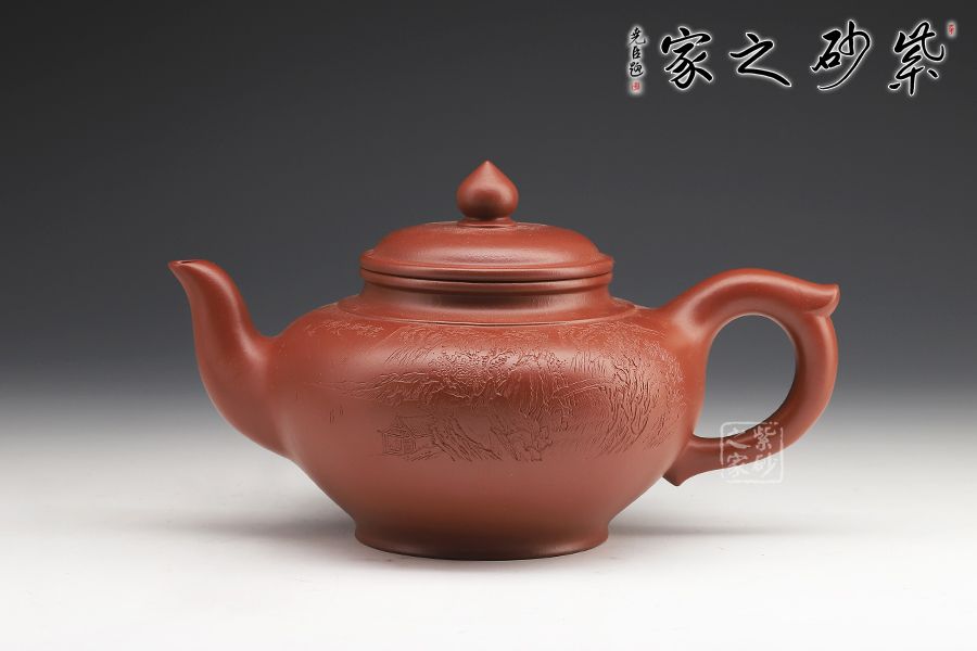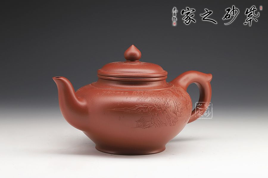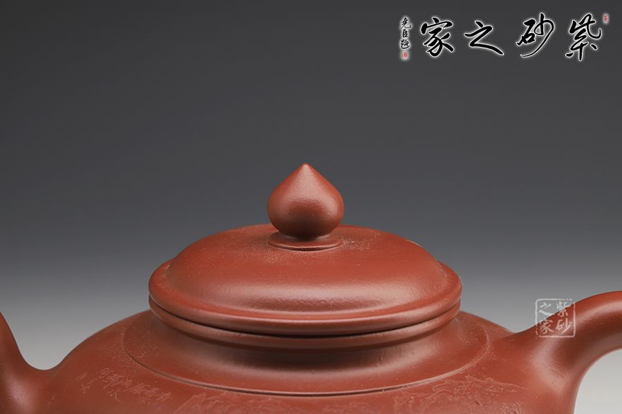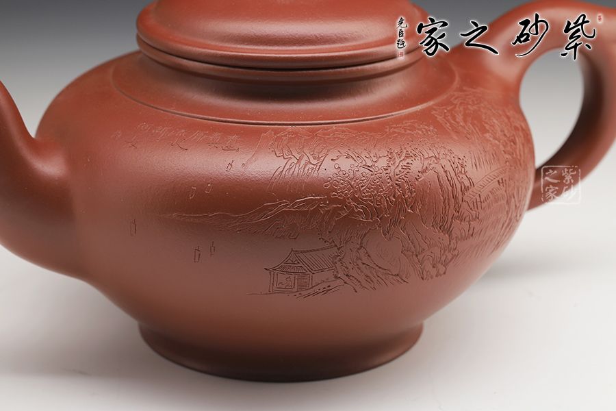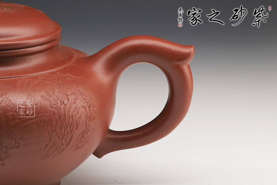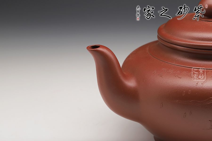 線(xiàn)條比例恰到好處,將笑櫻壺的魅力展現(xiàn)無(wú)遺。蓋咬合甚是緊密,云肩線(xiàn)清晰爽利,大氣。三彎流甚是優(yōu)美,將笑櫻壺的張力展現(xiàn)得淋漓盡致。飛把為耳形,的流把處處顯出精致、爽利。雙面刻繪更添文人氣息。