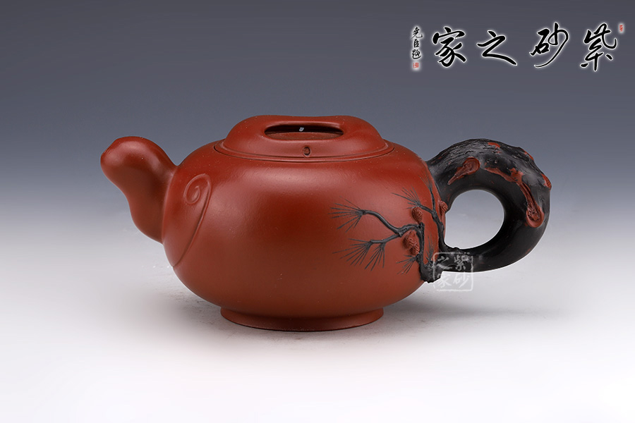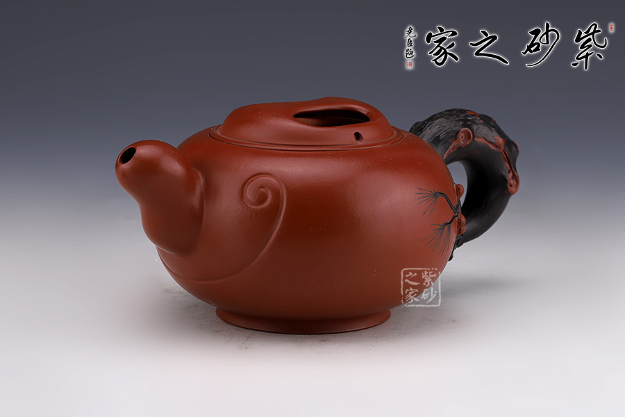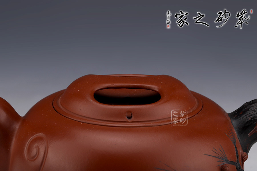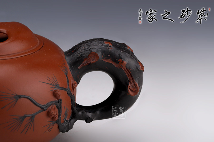 此壺壺身圓潤飽滿,線條流暢。壺柄耳大圓潤,握把舒適。壺蓋精致,蓋鈕朝上,如微微露出的牛鼻,巧妙自然,蓋身飽滿,采用了牛鼻孔式的鏤空結(jié)構(gòu),生動與趣味精美結(jié)合。壺把處胥出幾枝松枝,壺身如意裝飾,增加了整壺的觀賞性。
