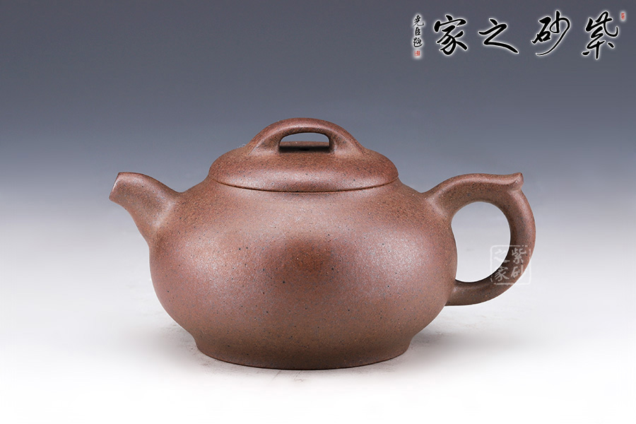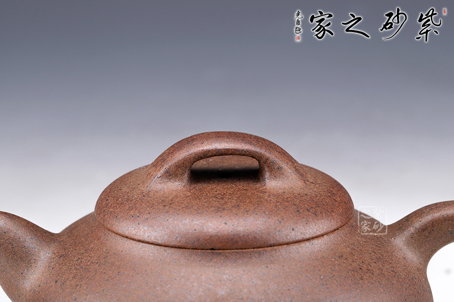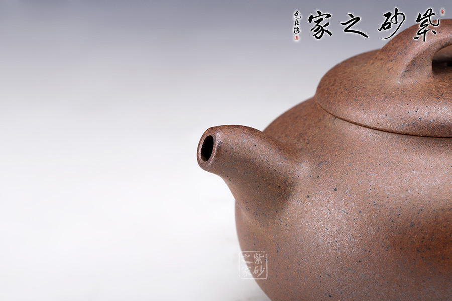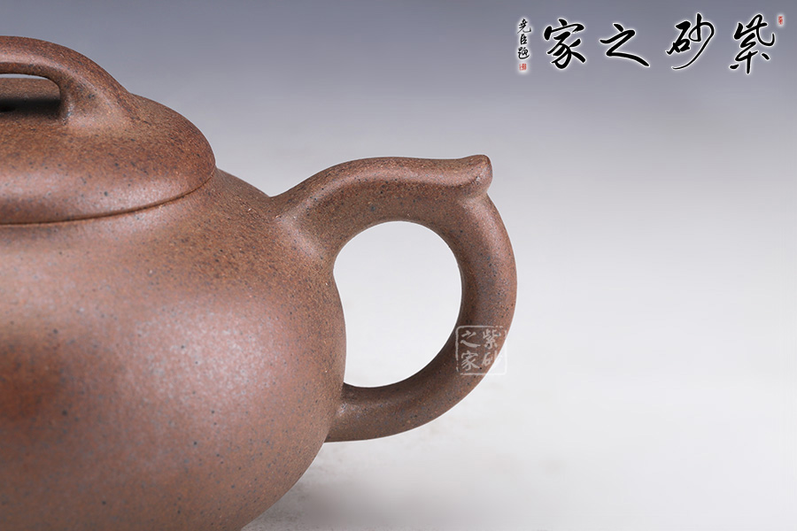 此壺圓潤(rùn)飽滿,脈絡(luò)清晰,流暢自然。彎流嘴,出水利落,小飛把,拿捏舒適。壺口壺蓋咬合十分吻合,氣密性良好。壺身素雅無(wú)裝飾,更顯古樸自然。