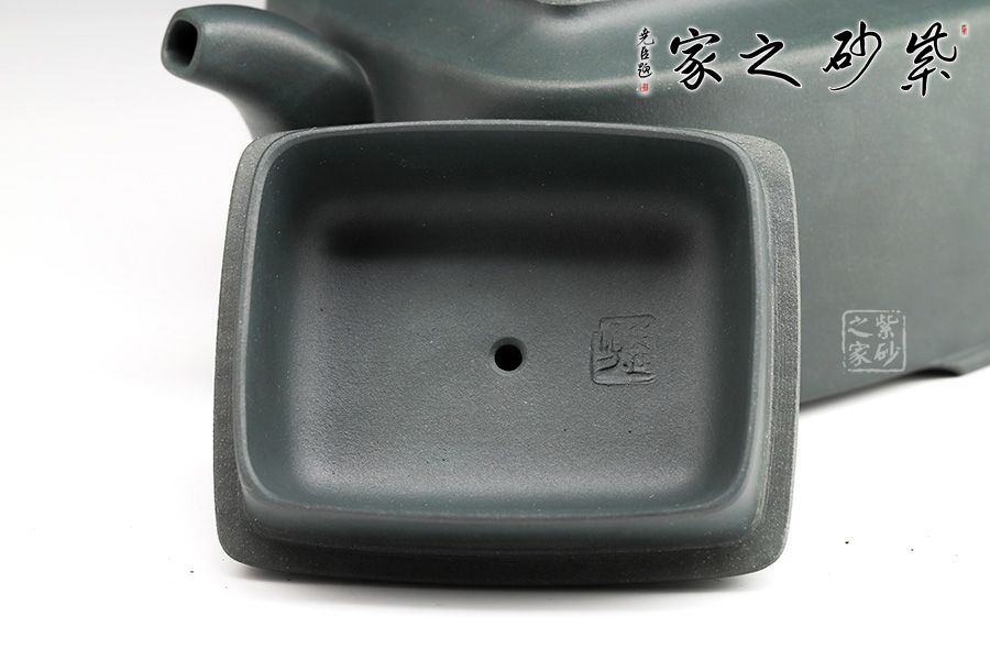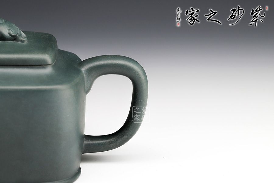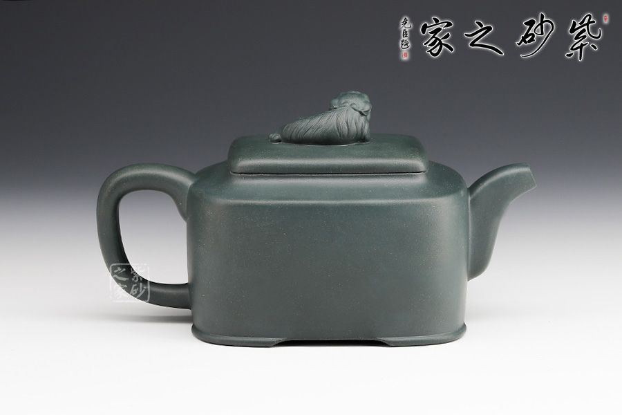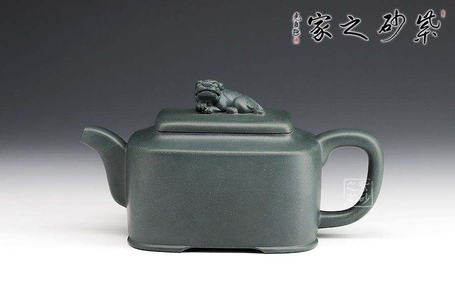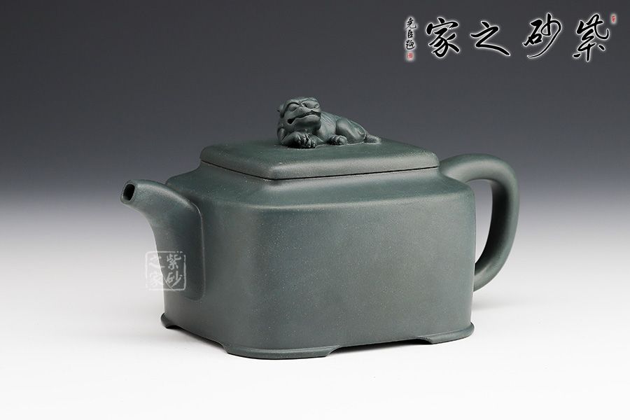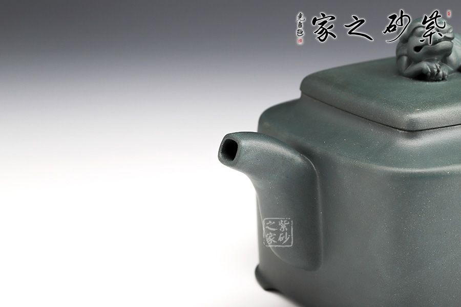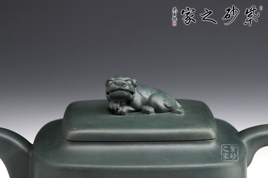 壺身四方造型,短頸,方壺口,蓋面鼓起,壺蓋之上伏一雄獅,精神昂揚(yáng)、生氣勃勃而又有親切感,四釘足,沉穩(wěn)大氣。高三彎嘴出水流利,耳把拿捏舒適。整款壺古樸、儒雅,氣韻不俗。