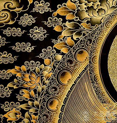 在繪制佛像服飾等位置時,用刻金技法,使圖案更具豐富的層次和立體感,用金勾勒的線條和圖案不但明亮度進一步提高,讓畫面更加燦爛,而且也使金在畫面上保持得更加長久。