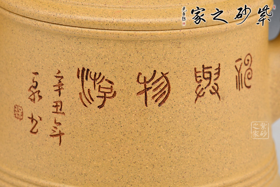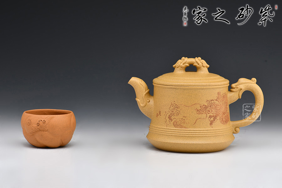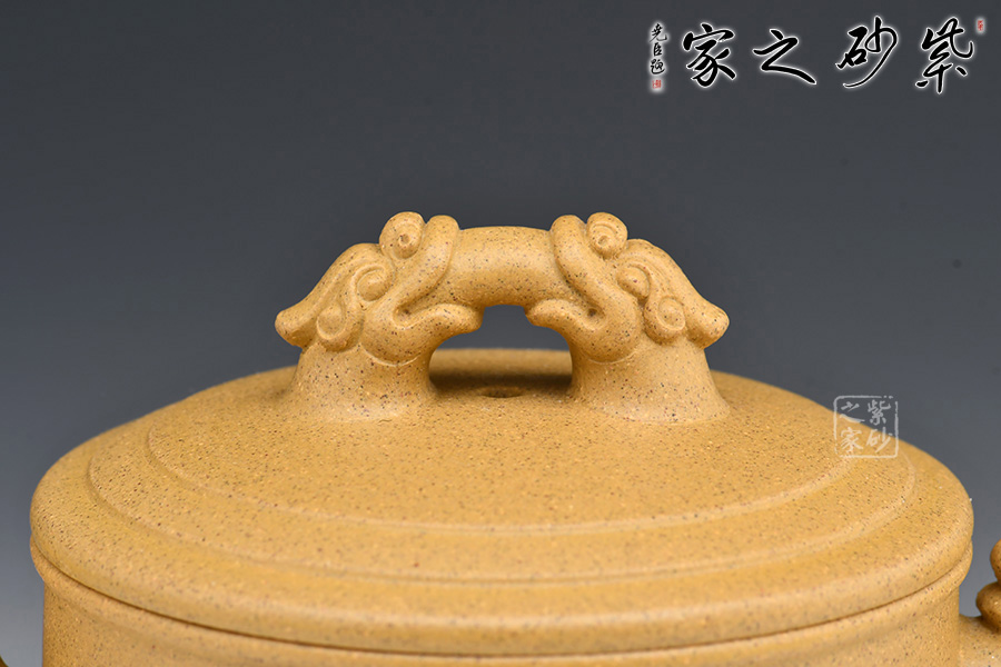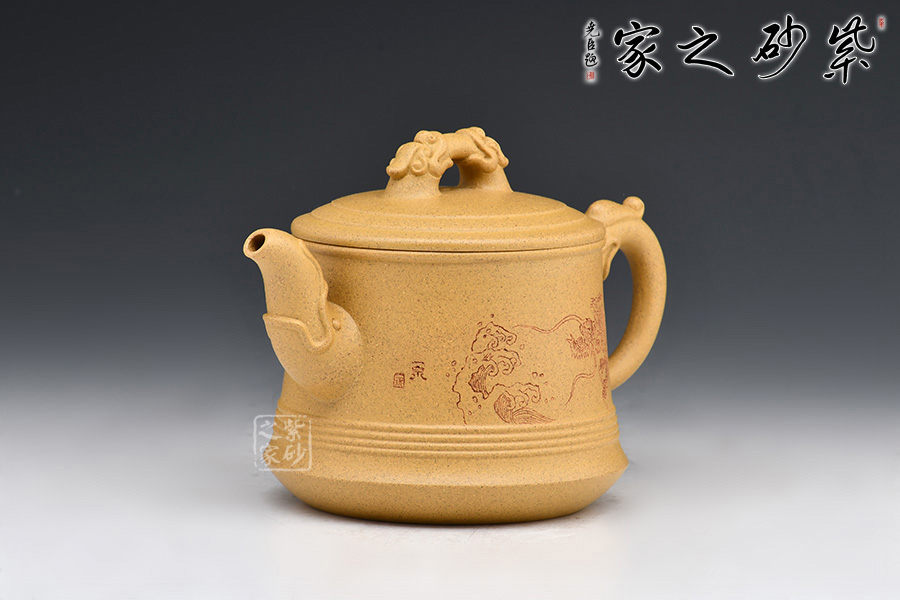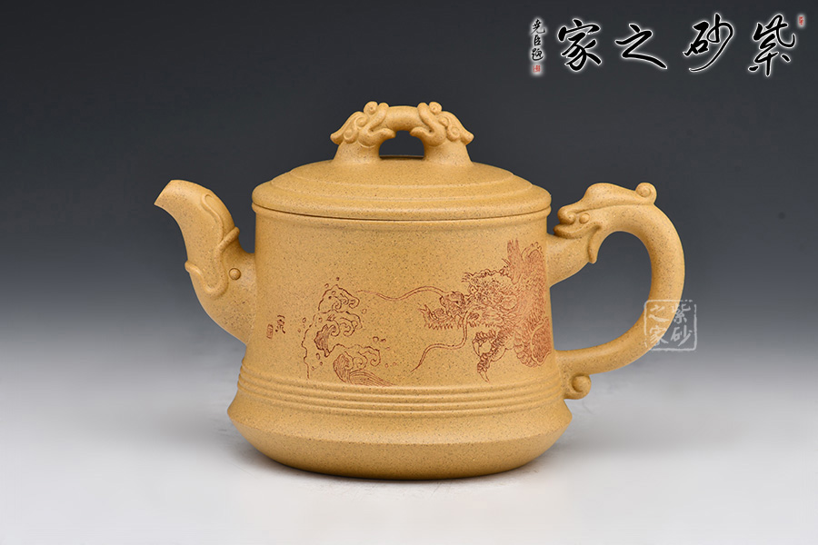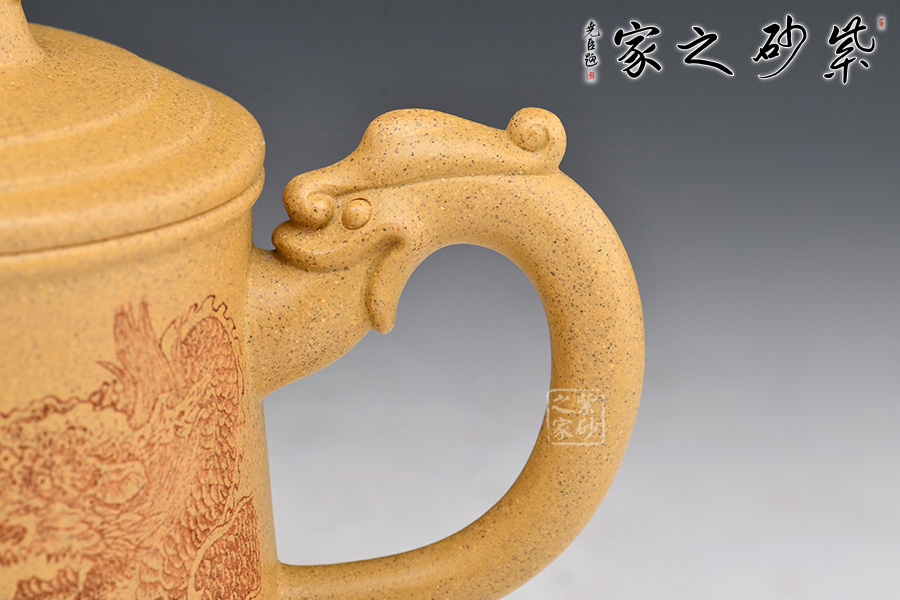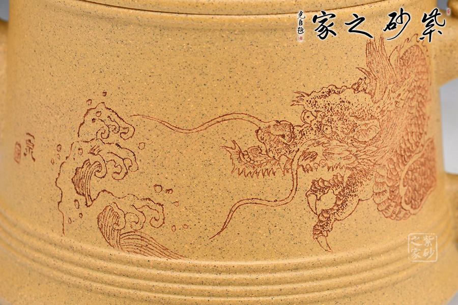 祥龍紫砂壺,壺身刻繪龍身,壺嘴、壺把、壺鈕均加入龍頭的元素,呼應(yīng)主題。壺蓋、壺底以簡(jiǎn)練的線條將壺體勾勒成水波粼粼的樣子,一幅巨龍從水中探出腦袋的畫(huà)面不由在腦海中升起。