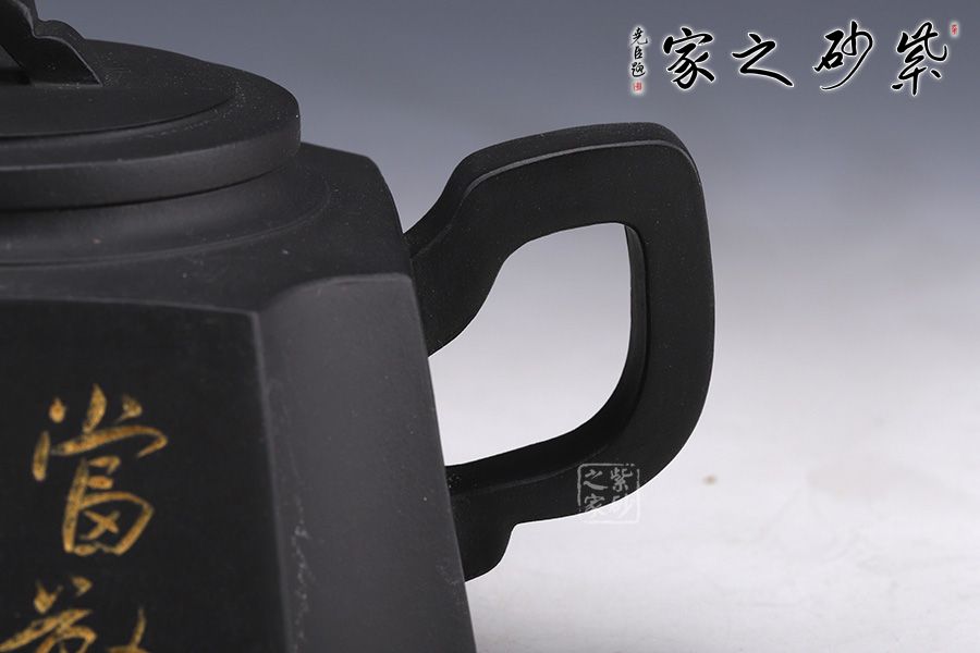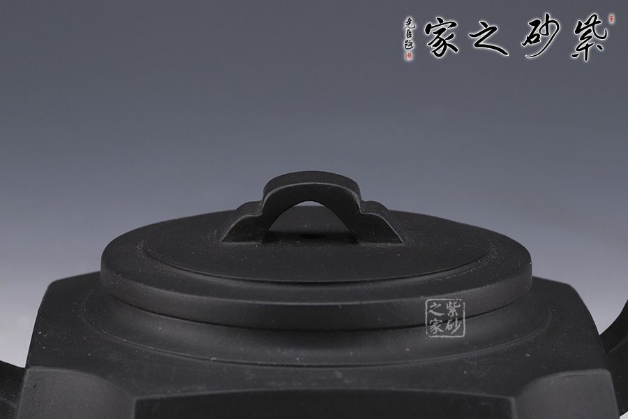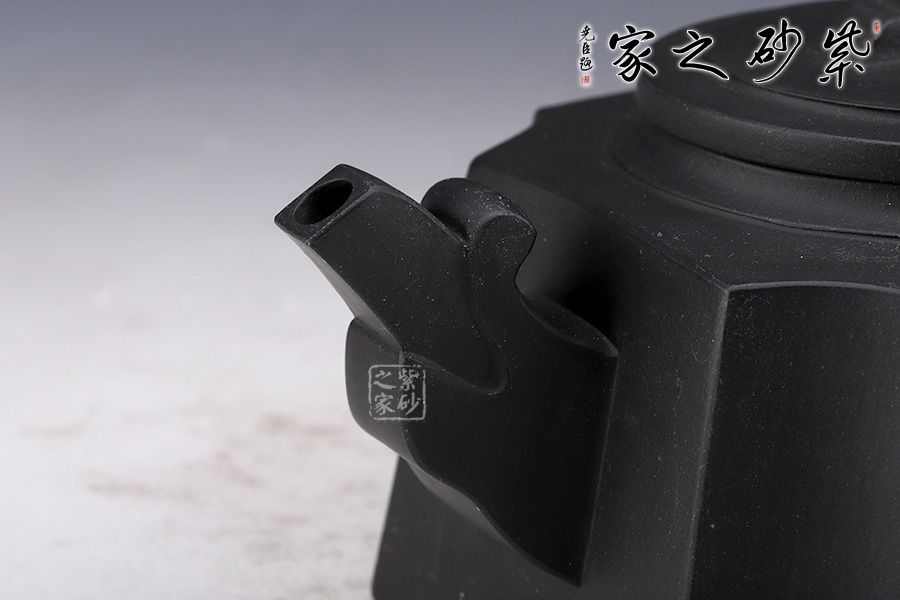 此款在四方壺造型上做了圓蓋的設(shè)計,又將四角加入圓弧設(shè)計,增加了器型的張力。雖說四方實則八面,又非正八面,有方中窺圓的精巧構(gòu)思。壺嘴水花形狀,似抽象的象征長壽的神龜,壺鈕有龜背花紋之感,整個壺呈現(xiàn)端莊穩(wěn)重的大將之風(fēng)。