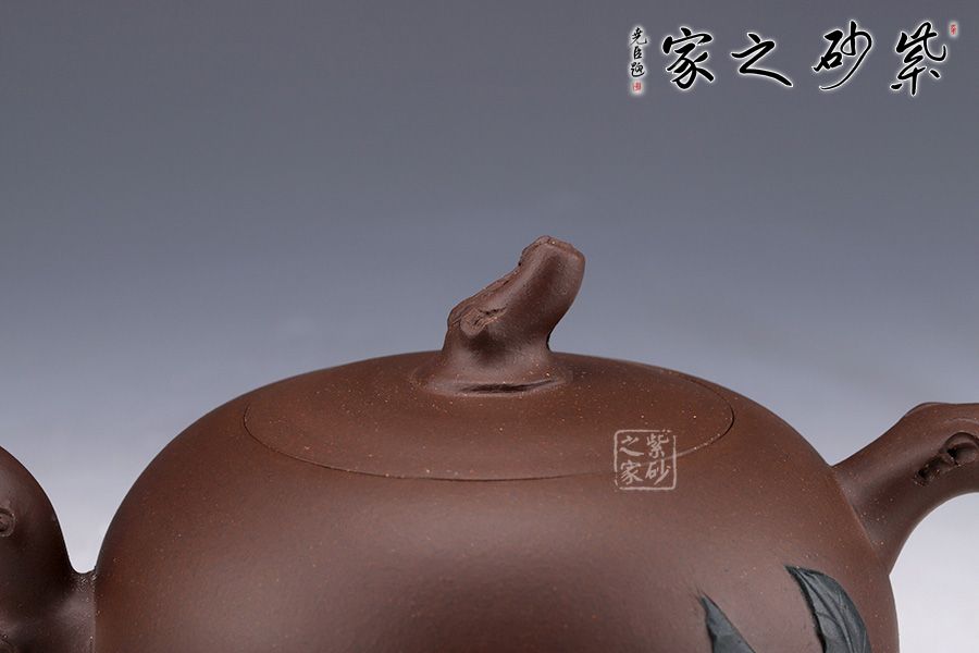 此秋碩壺,意為碩果累累的秋天是豐收的季節(jié)。此壺壺身圓潤謙和,靈動而有生氣。壺把樹樁紋理,與壺流有所對應(yīng)。整體色澤之古樸自不待言,器形之簡單、線條之收斂何處不體現(xiàn)出一種淡然之態(tài)。觀之整器,刻繪豐碩果實(shí)之感,處處都是自然而出,毫不張揚(yáng)。