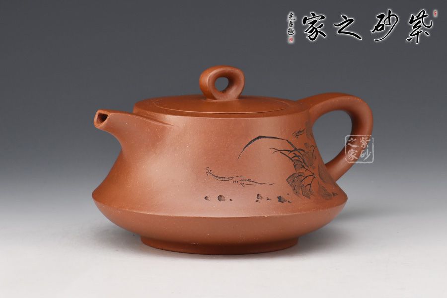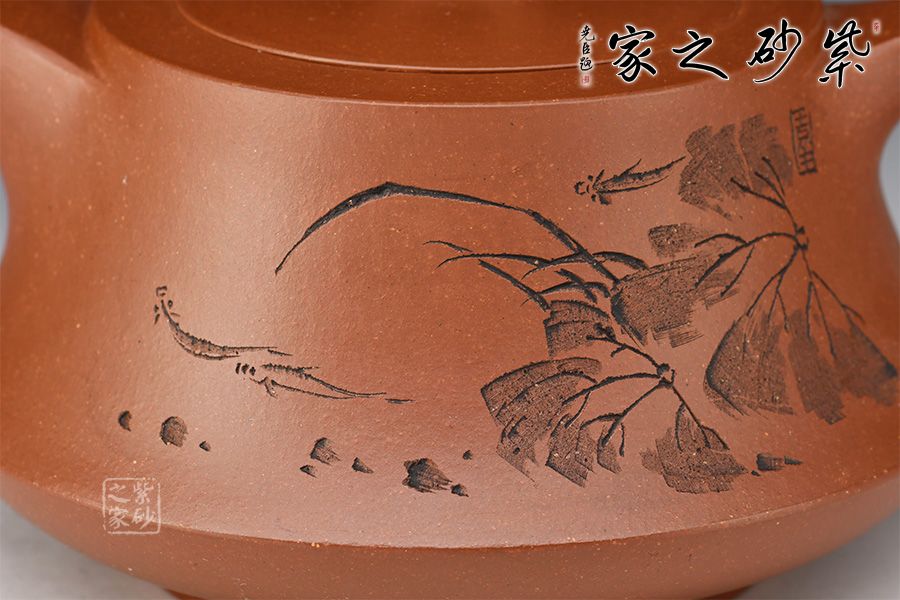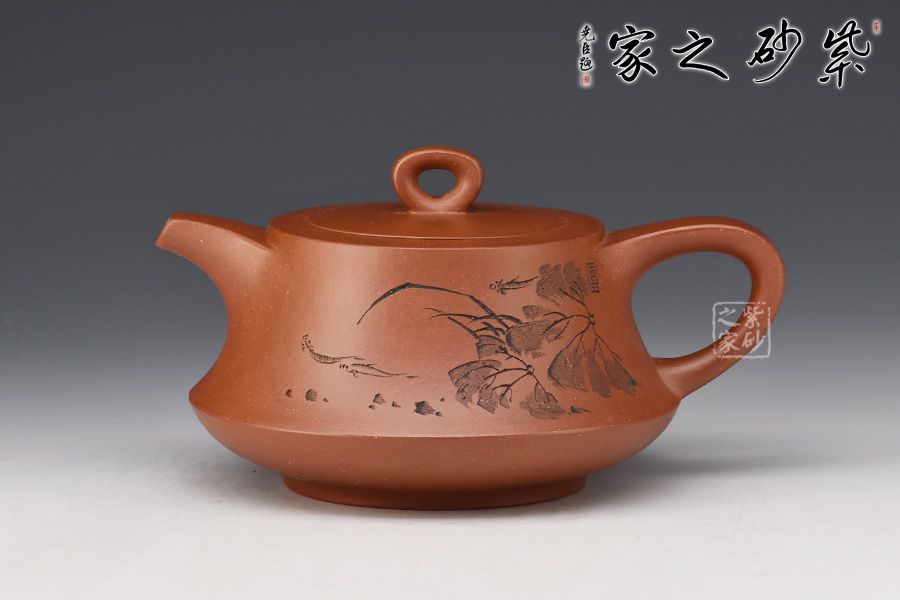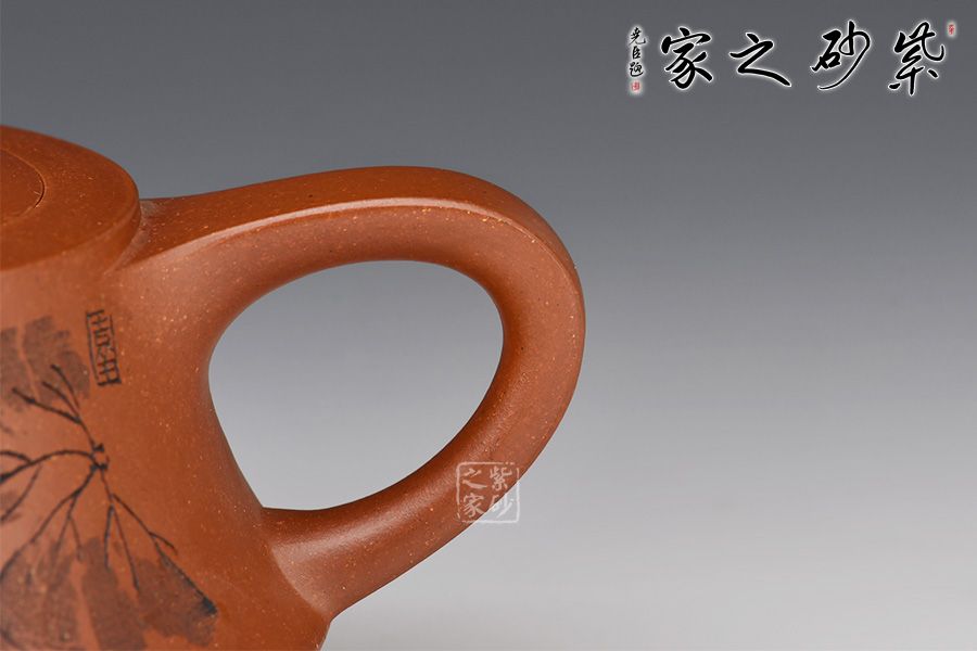壺身造型若一葉扁舟,上窄下寬,壺身向內(nèi)凹陷,力蘊十足,收勢干凈,壺鈕圓圈,極具動感。流把從壺腰線中起伏延伸,渾然一體,顯示了靜中的活力,靜中有動,動中有動,輪廓美和韻律美結(jié)合。